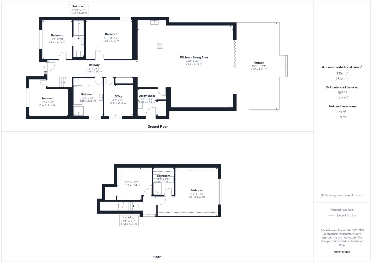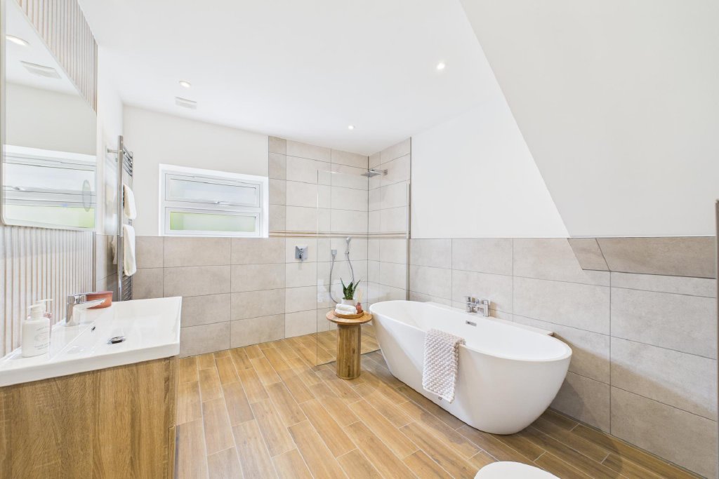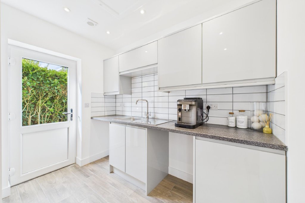 SITUATION & LOCATION Situated on the Western side of the historic Suffolk town of Bury St Edmunds, this delightful detached Chalet style home has been the subject of a complete restoration program by the present owners and now boasts spacious, versatile and contemporary accommodation throughout. Standing in good sized landscaped gardens of approximately 0.20 acres (subject to survey), the property, originally a bungalow now includes two first floor bedrooms, one with an en suite shower room. To the Ground floor there are four additional bedrooms, the guest bedroom also having an en suite shower room. There is also a family bathroom to the ground floor with separate walk-in shower area. The large contemporary kitchen/dining/family room constructed to the rear of the property is an exceptionally light and airy space, ideal for family get togethers and entertaining and enjoys a southerly aspect through 5m bi- fold doors onto the beautiful porcelain south facing sun terrace and gardens. The kitchen area includes an extensive range of cabinets as well as an island breakfast bar, all with matching Karonia solid work surfaces and an array of integrated appliances. Off the kitchen area is a useful utility room.