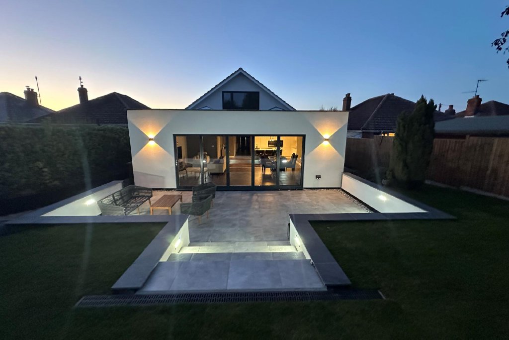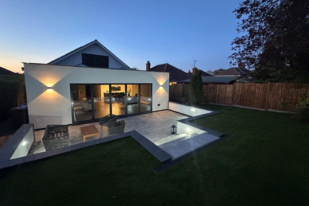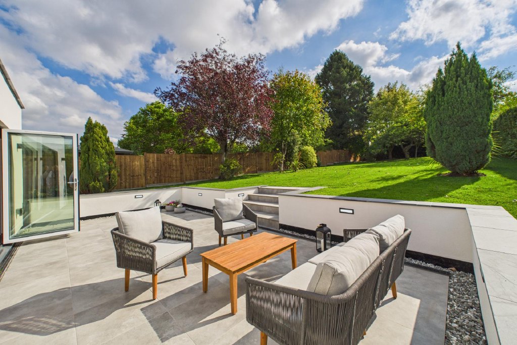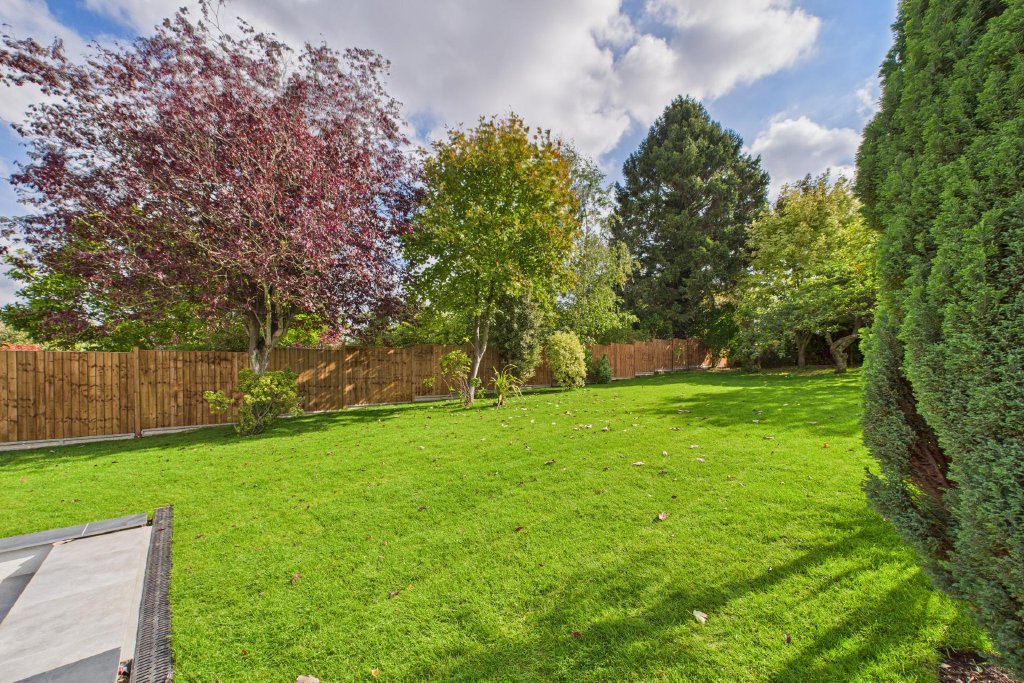 The large rear garden is enclosed by a mixture of timber fencing and mature hedging. Already established with some mature trees, shrubs and bushes, a porcelain paved patio has been laid and retained by low rendered walling with integrated lighting. Steps lead up to the newly lawned garden.