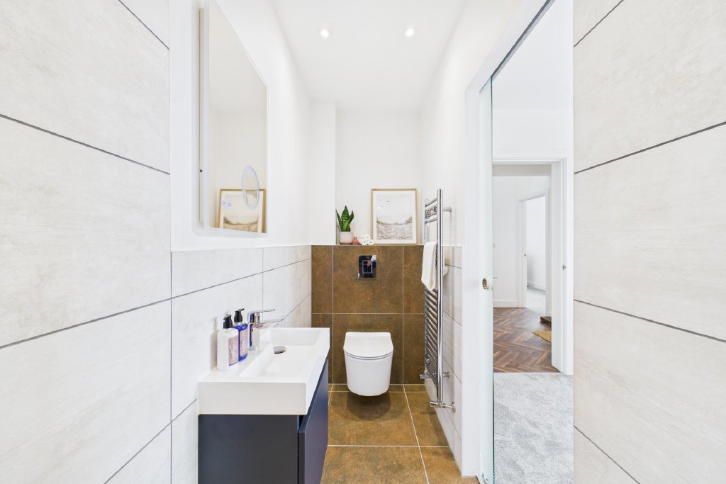 ENSUITE SHOWER ROOM With translucent glazed sliding entrance door. Large walk-in shower area with low profile shower tray. Fully tiled with thermostatically controlled shower unit including overhead rain shower and handheld shower attachment; floating vanity wash basin with Bluetooth connected illuminated mirror over, floating WC. Wall mounted ladder style chrome heated towel rail.