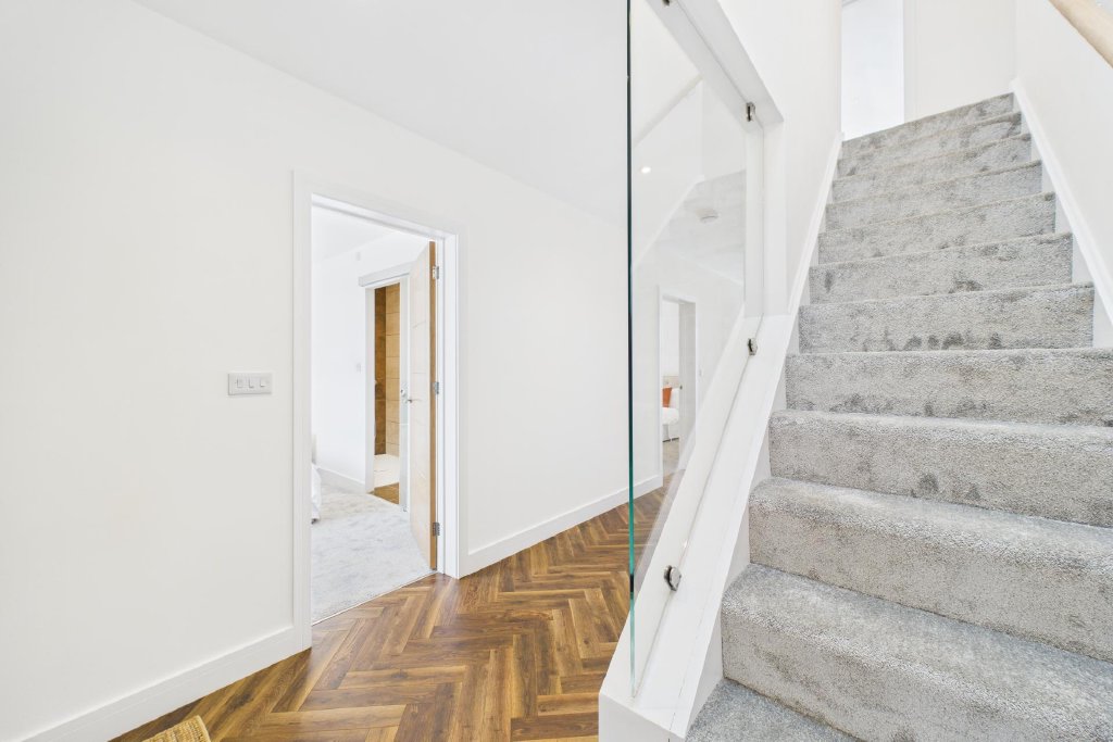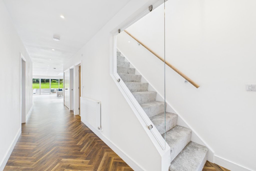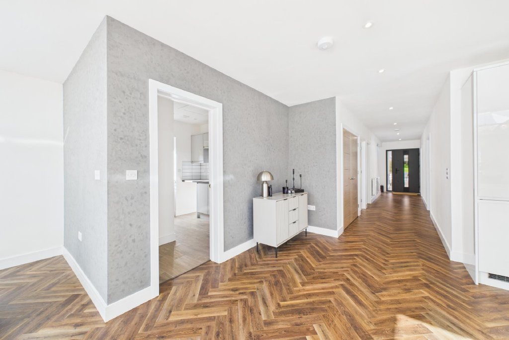 RECEPTION HALLWAY With composite mirror glazed entrance door; Herringbone Oak style flooring; radiator; recessed LED lighting; staircase leading to 1st floor; fitted double storage cupboard.