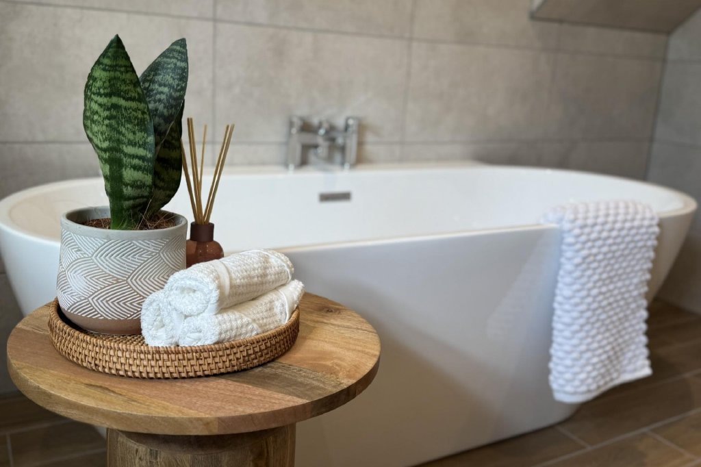 BATHROOM Beautifully fitted with tiled walk-in shower area incorporating thermostatically controlled shower unit with overhead rain shower and held shower attachment, glass screen. Double ended bath with mixer tap, floating vanity wash basin with drawers below with illuminated Bluetooth mirror above, floating WC. Part tiling to walls and ceramic tiled floor; Chrome heated towel rail, LED ceiling lighting and UPVC double glazed window.