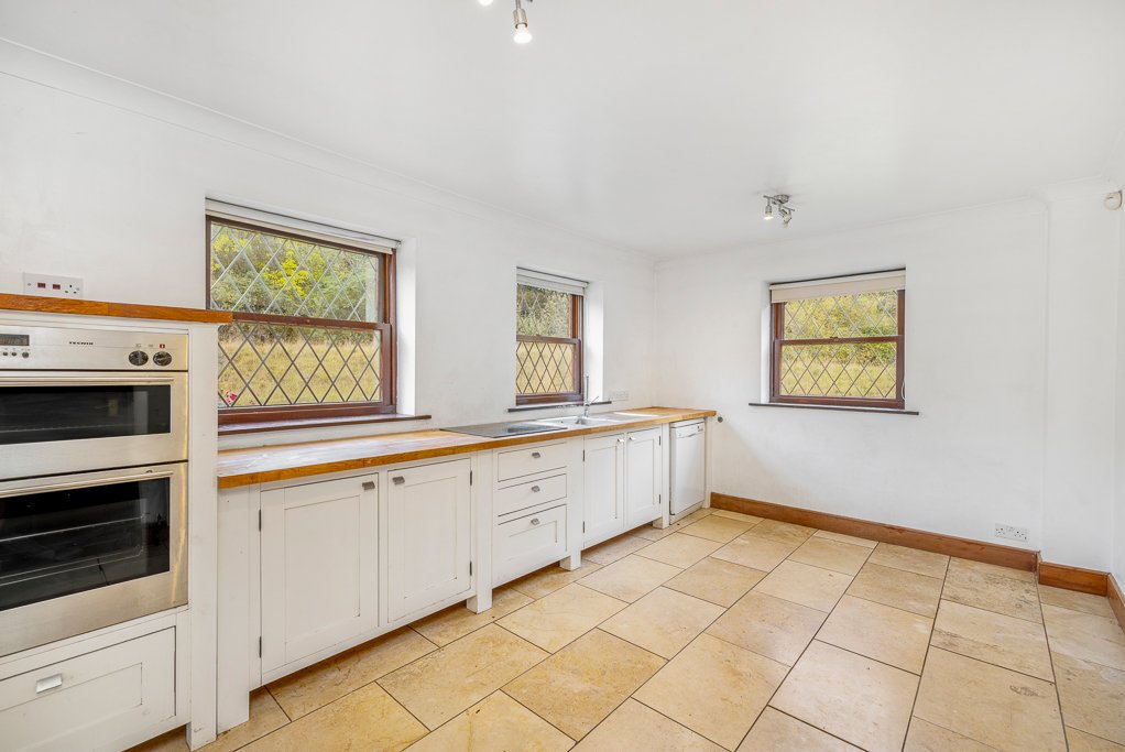 - Bright kitchen with shaker style cabinets, solid wood worktops and tiled floor