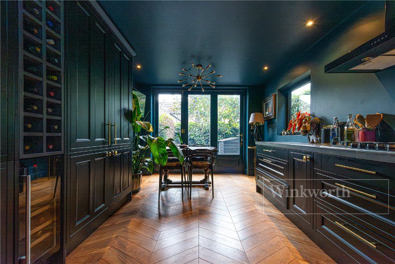 The ground floor features a spacious open-plan living and dining room—ideal for entertaining or relaxed family life alongside a sleek, fully-fitted and colour drenched kitchen with modern finishes and ample storage. The kitchen opens directly onto a sunny, low maintenance south-facing garden. A further benefit includes a well-appointed guest WC.