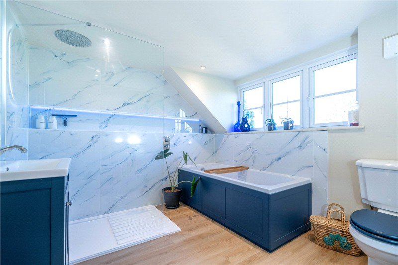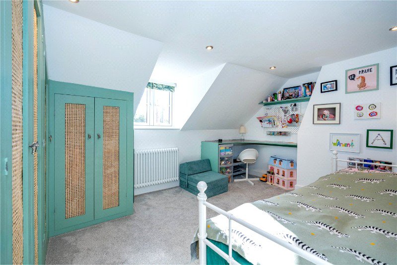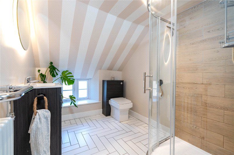 Upstairs, there are four bedrooms, each individually styled and full of character. The main bedroom benefits from built-in wardrobes and an en-suite shower room, while the remaining bedrooms are served by a modern family bathroom with both bath and walk-in shower.