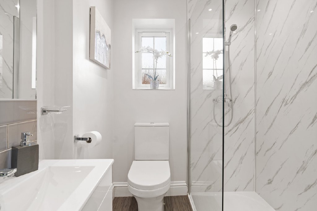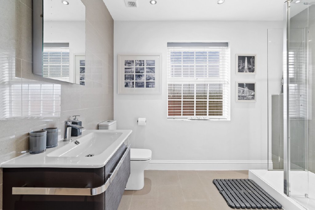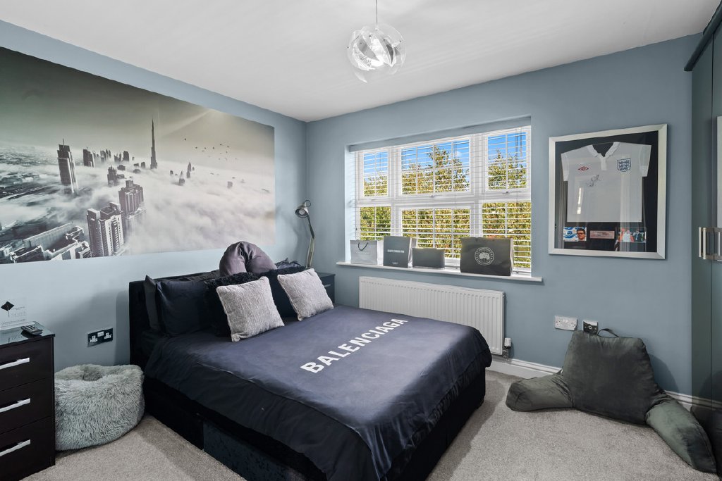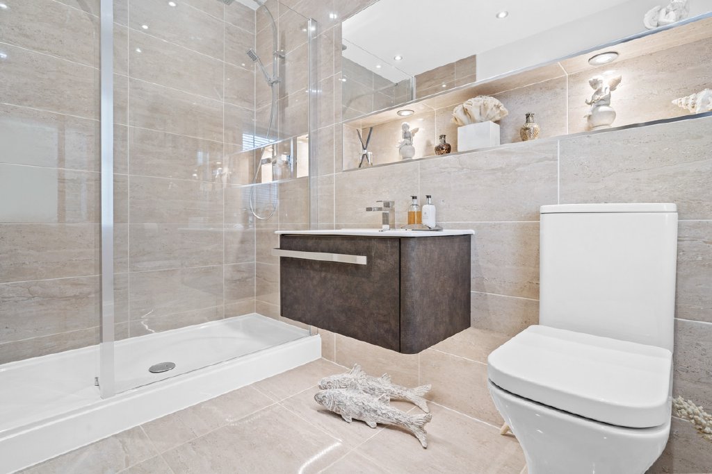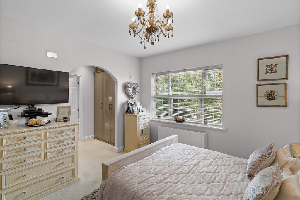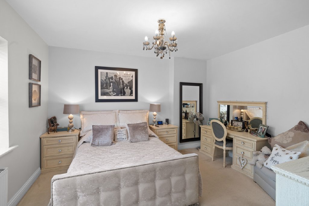The principal bedroom itself is beautifully appointed, benefitting from a dressing area and a boutique-style ensuite featuring a double walk-in shower, sleek fittings and marble-effect tiling.