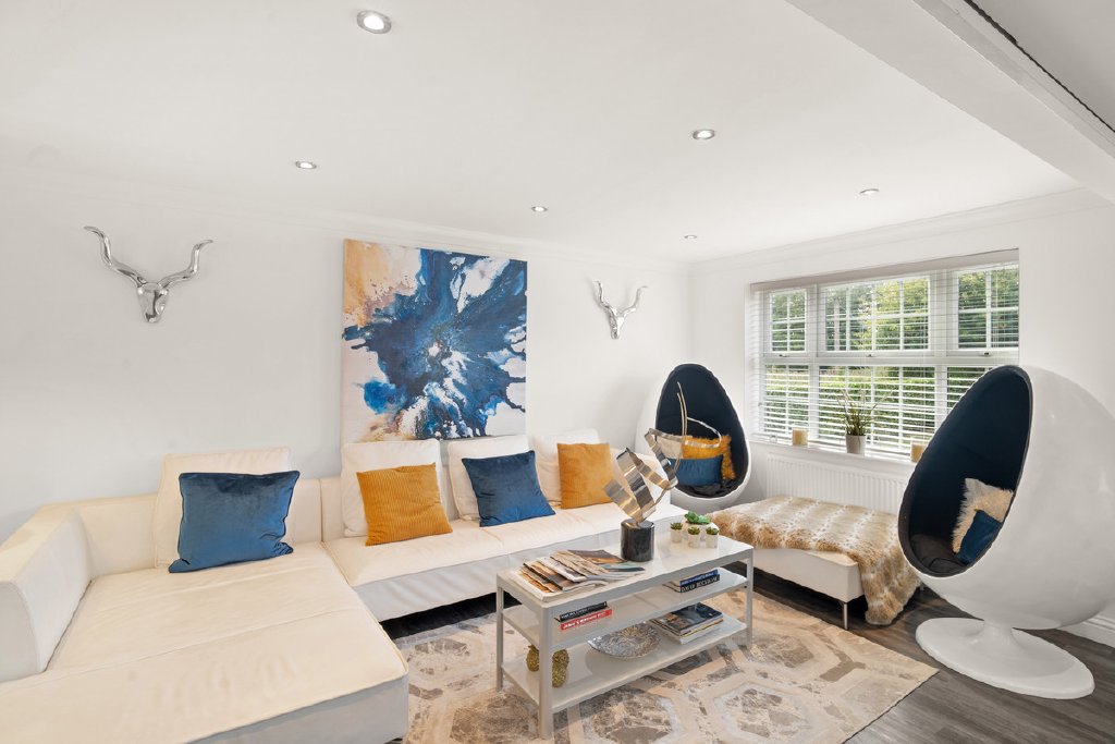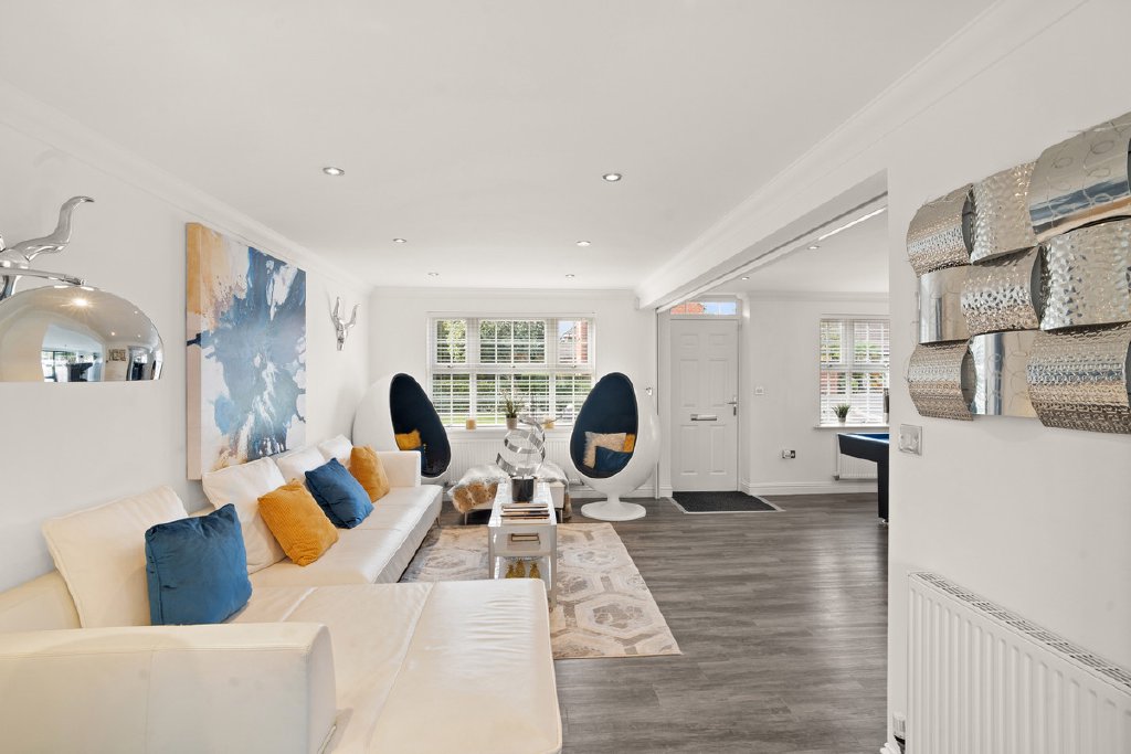 The magnificent living kitchen/dining/family room forms the heart of the home, fitted with a bespoke range of wall and base units complemented by quartz worktops and high-specification appliances including a Neff induction hob, dual Neff ovens, Neff microwave with warming drawer, Bosch dishwasher, integrated fridge/freezer, and wine cooler. A large central island with seating provides the perfect focal point for family gatherings and entertaining. Bi-fold doors open directly onto the landscaped rear garden, blurring the line between inside and out.