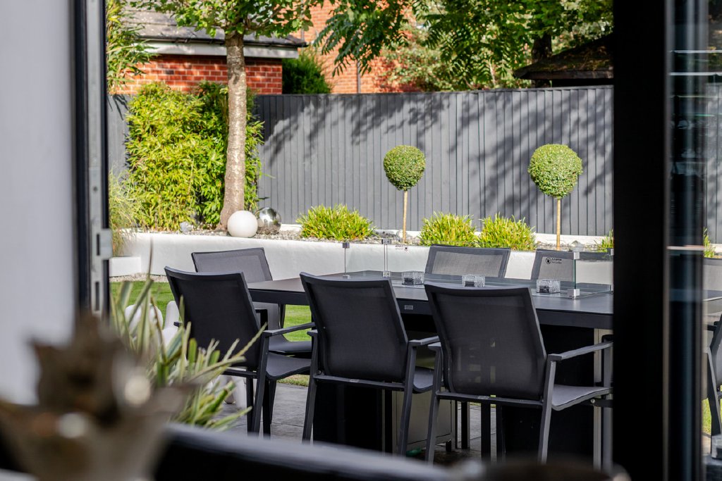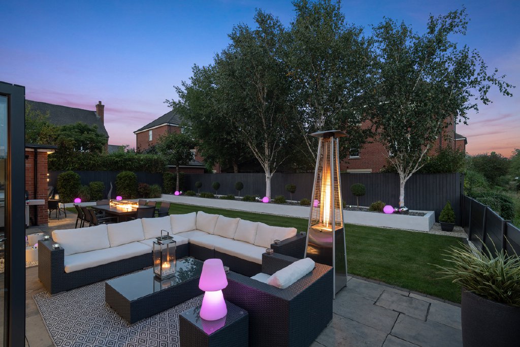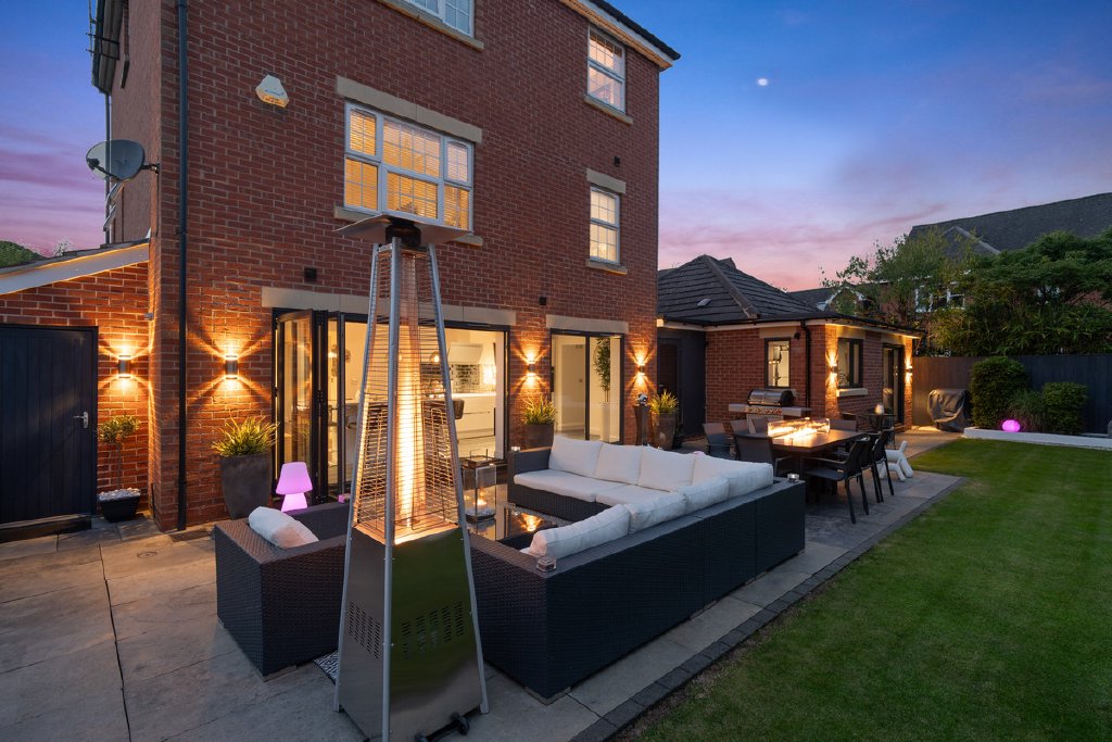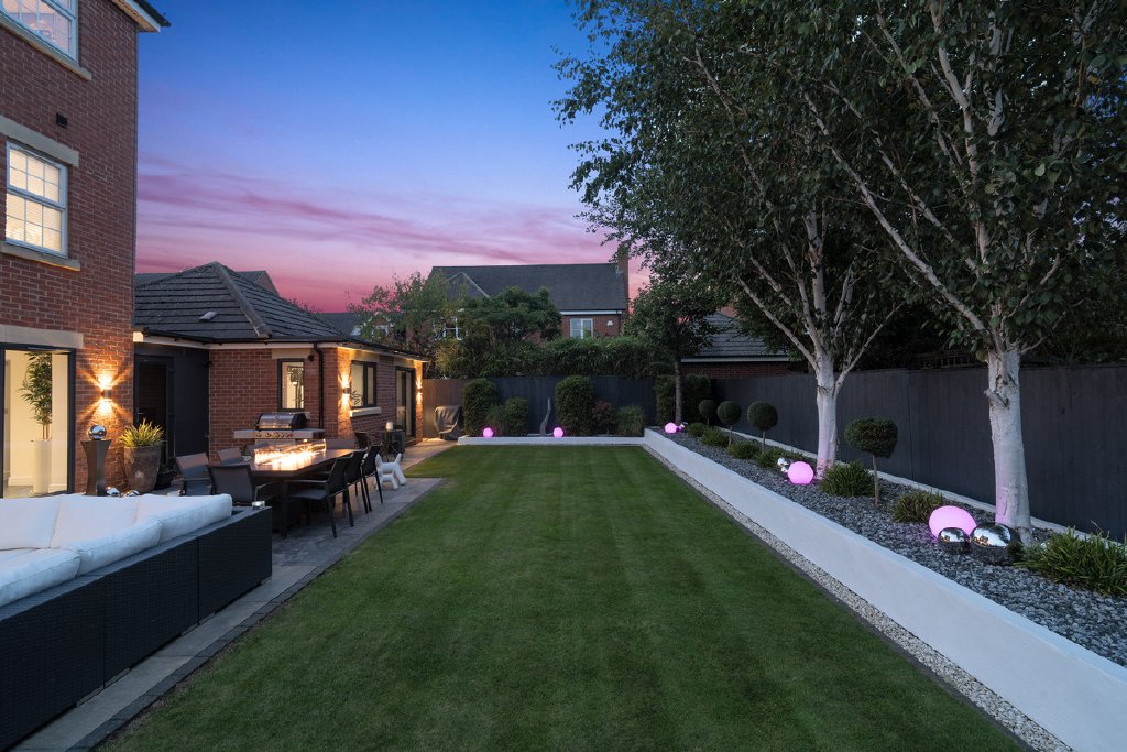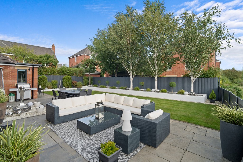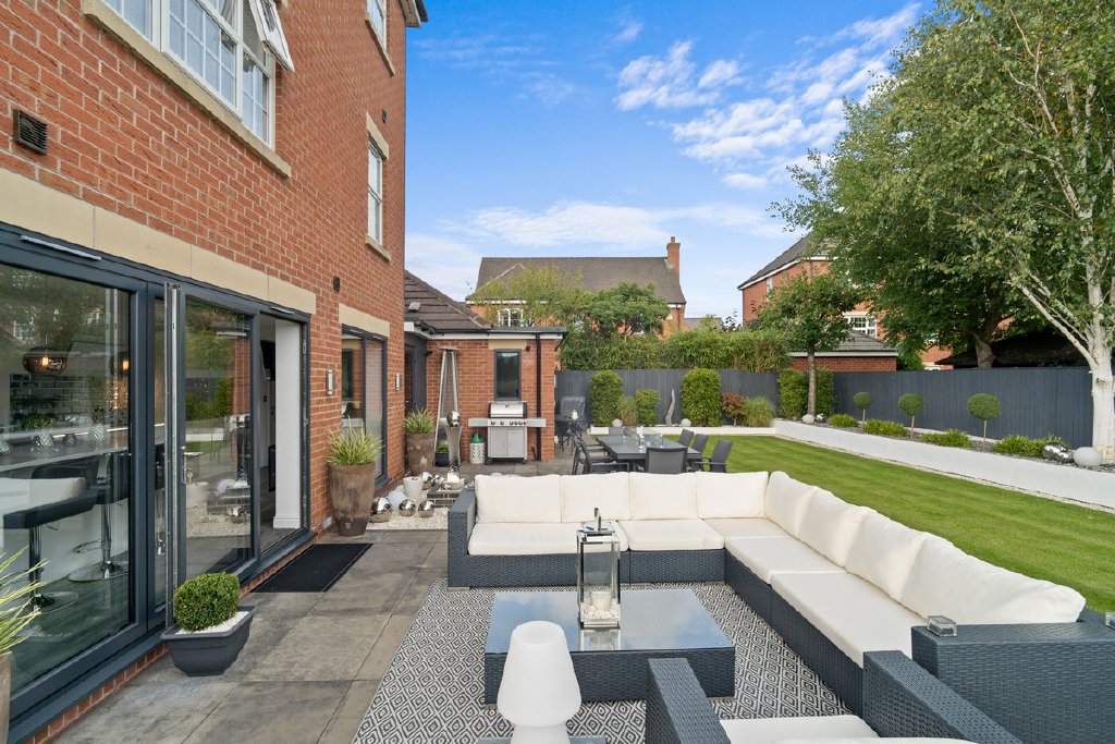 - Landscaped gardens with terrace, water feature & firepit