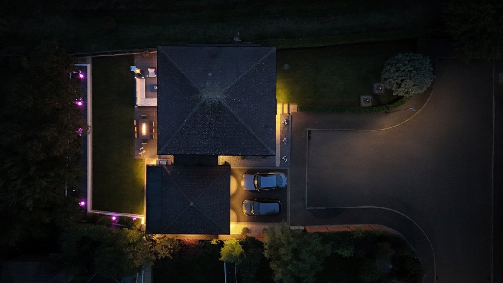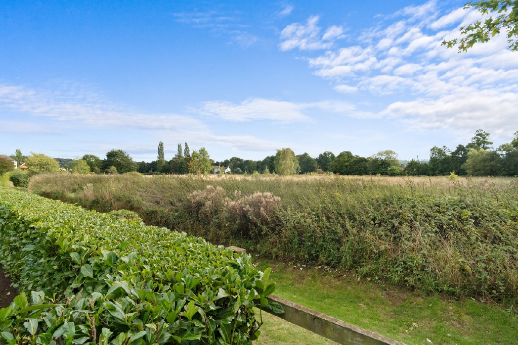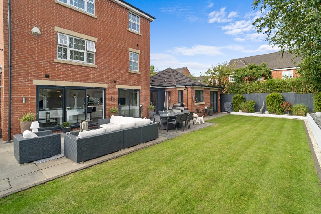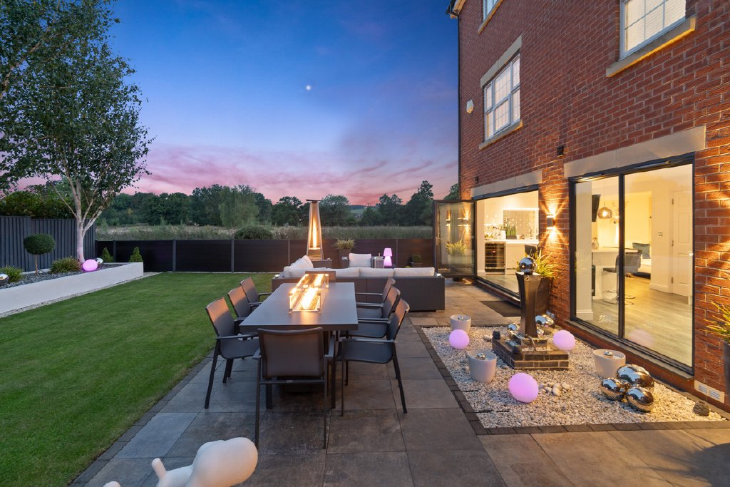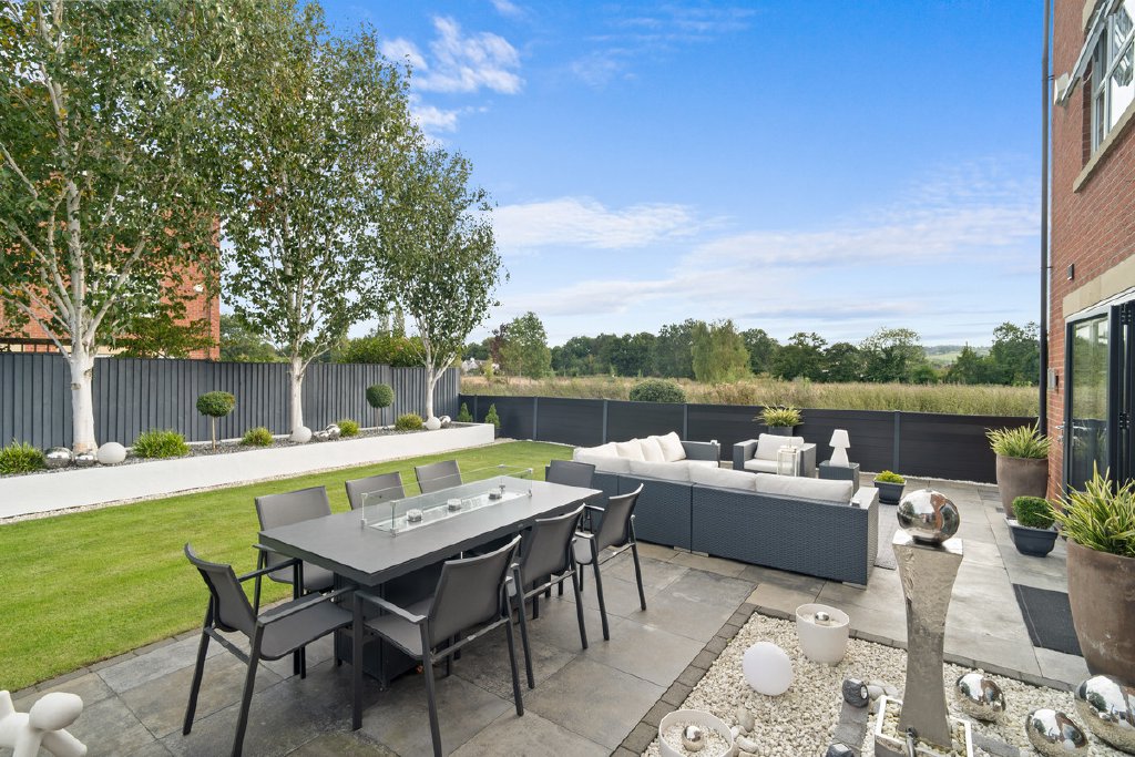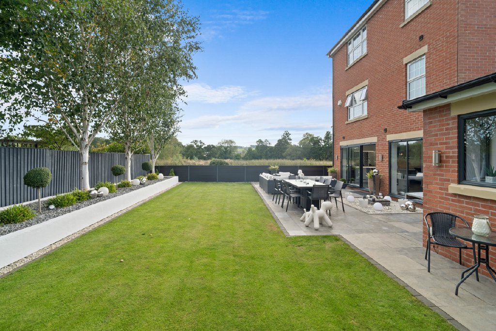 The rear garden has been designed for both ease of maintenance and style, with a large sun terrace perfect for alfresco dining, level lawned areas, modern raised beds, clipped hedging, and a contemporary water feature. Thoughtful lighting enhances the ambiance into the evening, while the uninterrupted views towards open fields and countryside create a truly special setting.