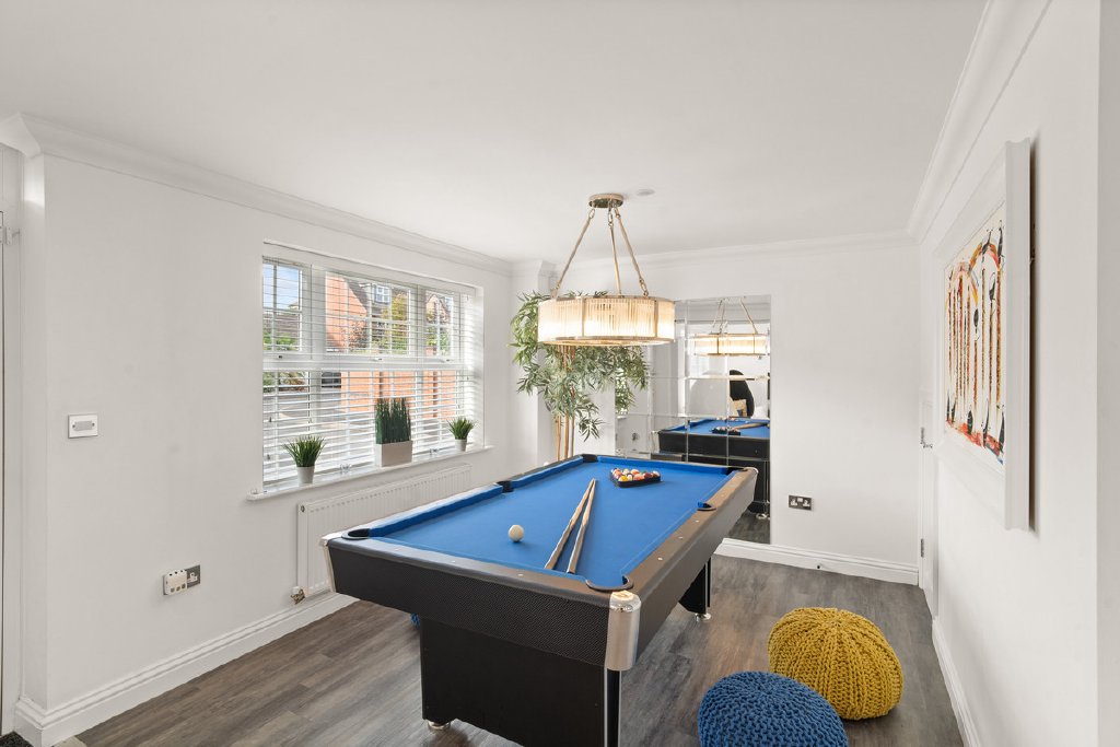 A welcoming lounge and games area provide further versatility, ideal for relaxing, entertaining or family life. Practical features include a walk-in pantry, cloakroom, and utility room with access to the garden.