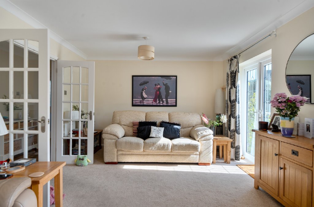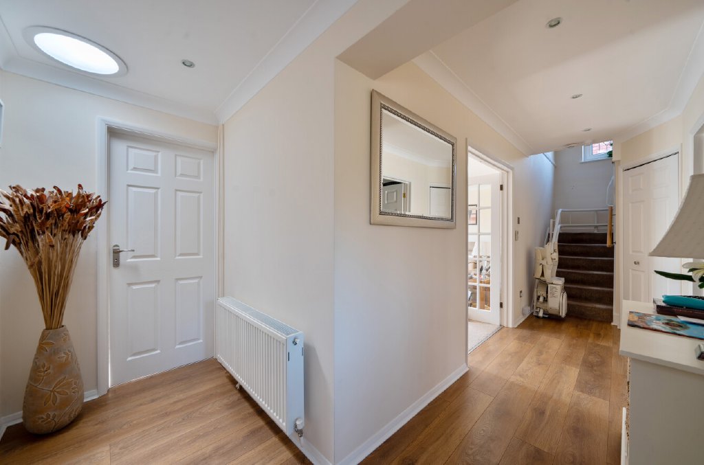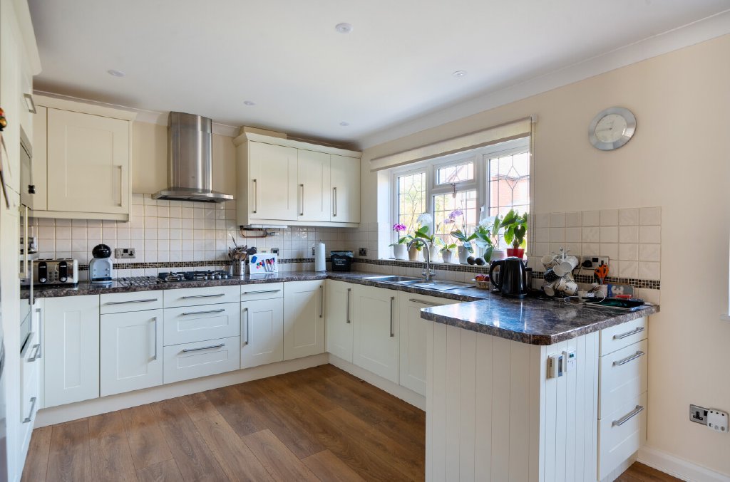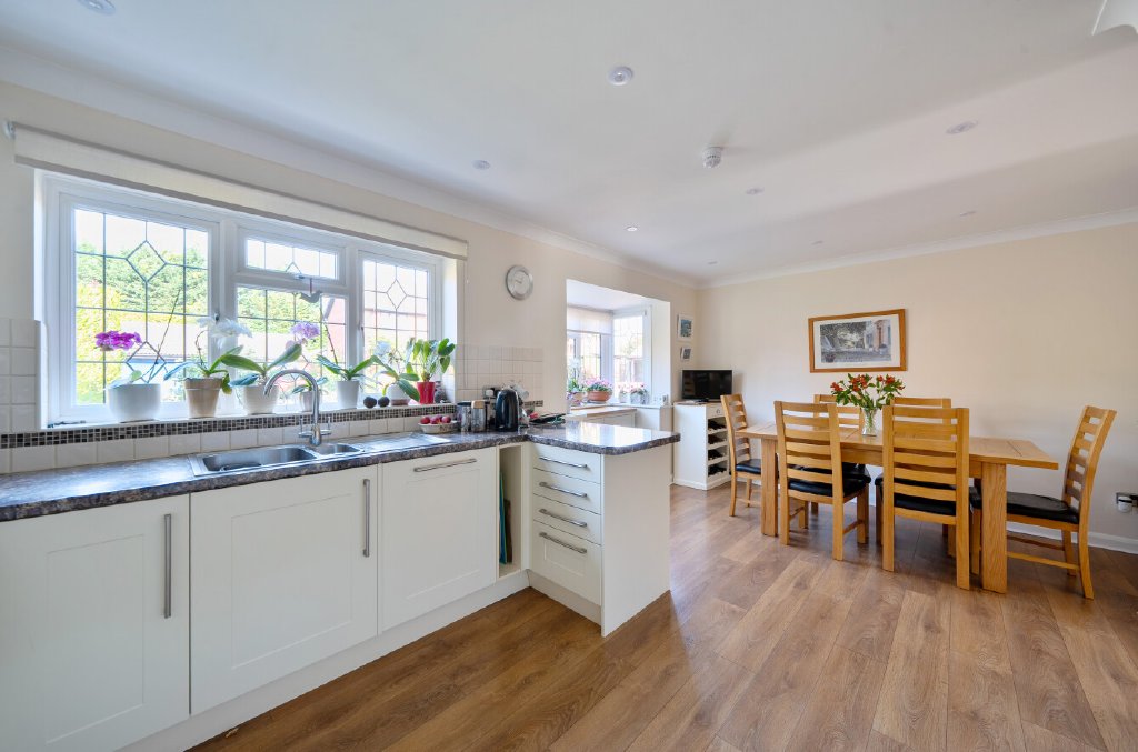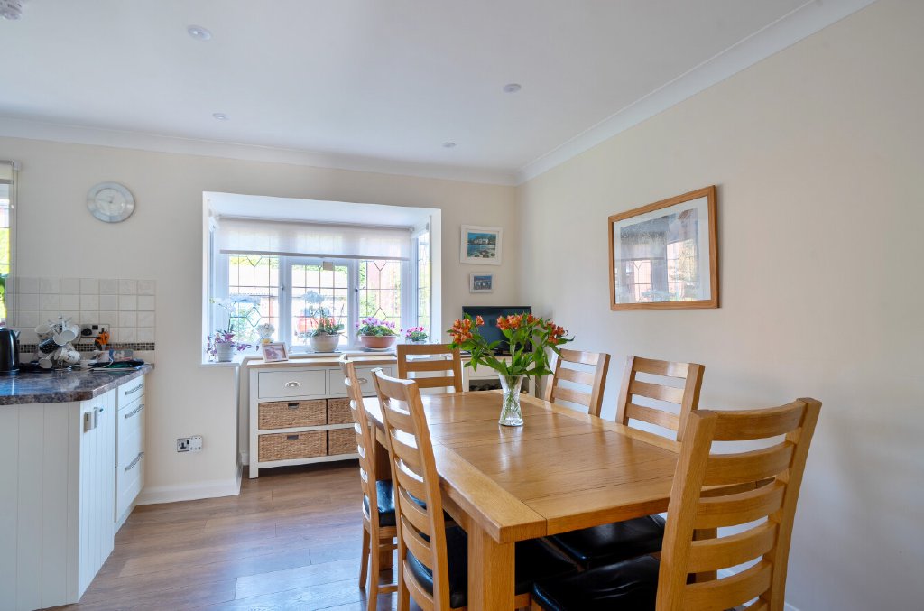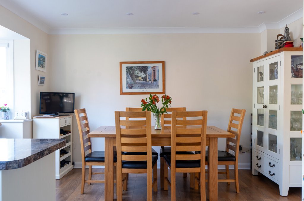 The ground floor is centred around a bright and spacious sitting room, perfect for gathering together after a busy day. French doors open directly onto the garden, allowing children to play safely outside while adults enjoy a relaxed indoor–outdoor flow. An open-plan kitchen and dining area provides the heart of the home, with ample storage, and room for family meals or entertaining friends.