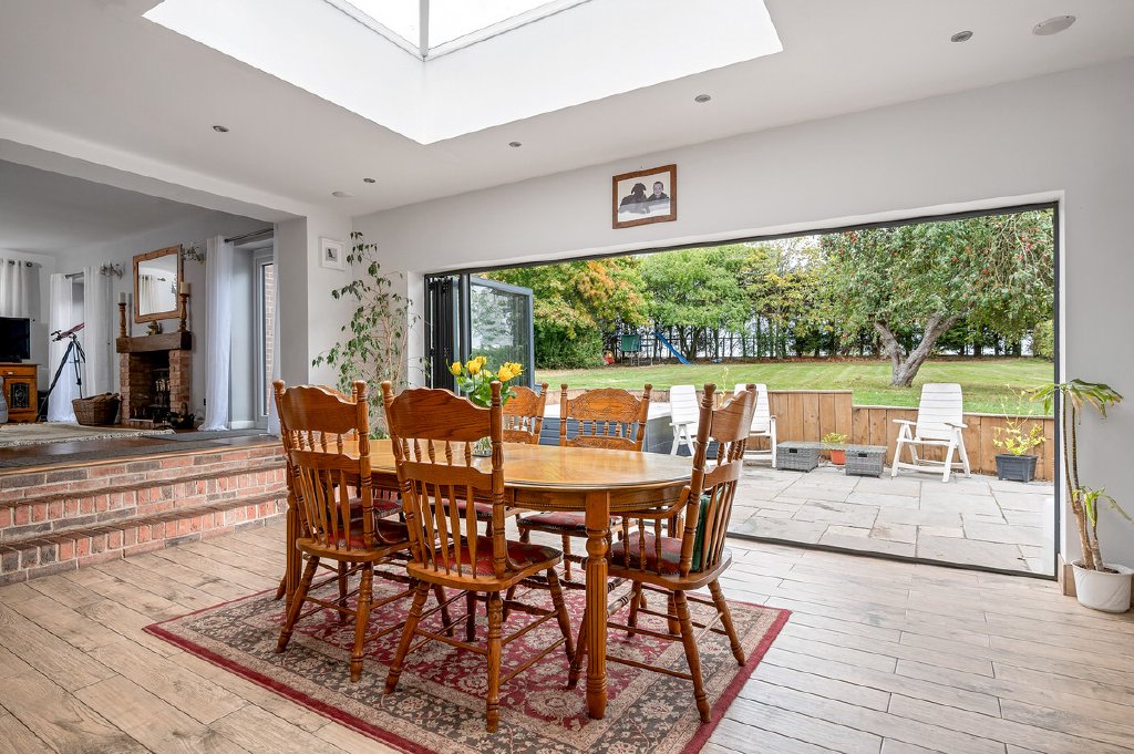 The property is entered through a half-glazed door into a welcoming central hallway, where an open balustraded staircase rises to the first floor. From here, two reception rooms lead off: a spacious sitting room with an electric feature fire and triple-aspect windows, and a cosy snug ideal for relaxing. At the heart of the home lies the impressive kitchen, designed with entertaining in mind. A striking lantern roof and bifold doors flood the space with natural light while framing views of the garden. Fitted with a range of cabinets, the kitchen includes space for an electric\LPG range-style cooker with extractor hood and plumbing for an American-style fridge/freezer. A utility room with plumbing adjoins, while from the dining area, steps rise to a generous family room with log burning stove.