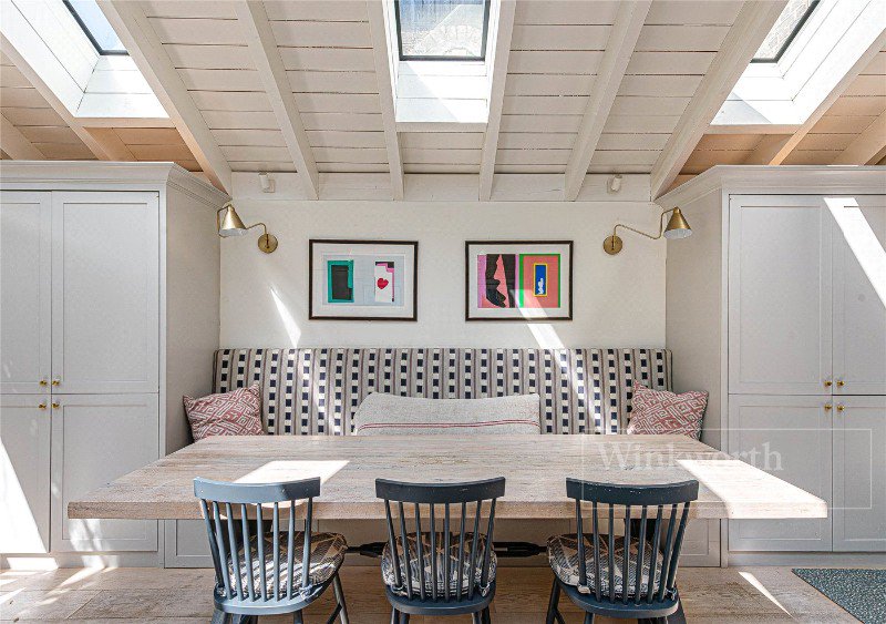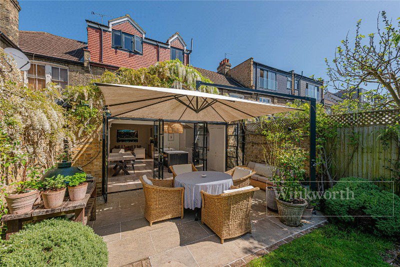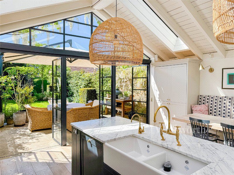 The heart of the home is a stunning rear extension, where a bespoke kitchen-diner is flooded with natural light from expansive Crittall-style doors. These open directly onto a sun-drenched, south-facing garden—perfect for entertaining, al fresco dining, or simply enjoying peaceful afternoons in the sun.