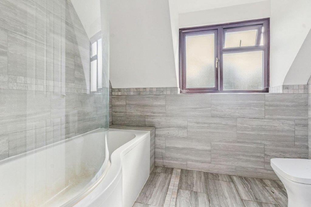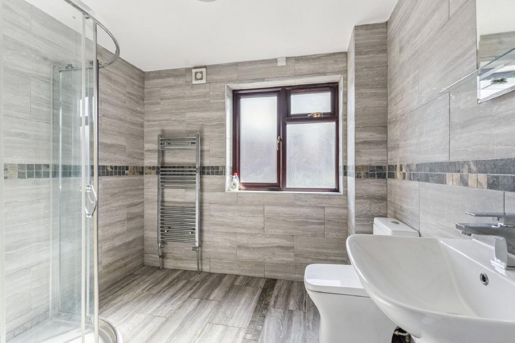 Ascending from the entrance hall, stairs lead to the first-floor landing, which provides access to three double bedrooms and a refitted family bathroom. At the front of the home, the master bedroom is a generous double, offering ample space and natural light. Bedrooms two and three, situated at the rear, are both well-proportioned doubles and enjoy elevated views over the private rear garden. The family bathroom serves all three bedrooms and has been tastefully modernised. Fully tiled from floor to ceiling, it features a low-level W.C., pedestal wash hand basin, and a ‘P’-shaped panelled bath with an overhead shower, combining practicality with the convenience required for modern family living.