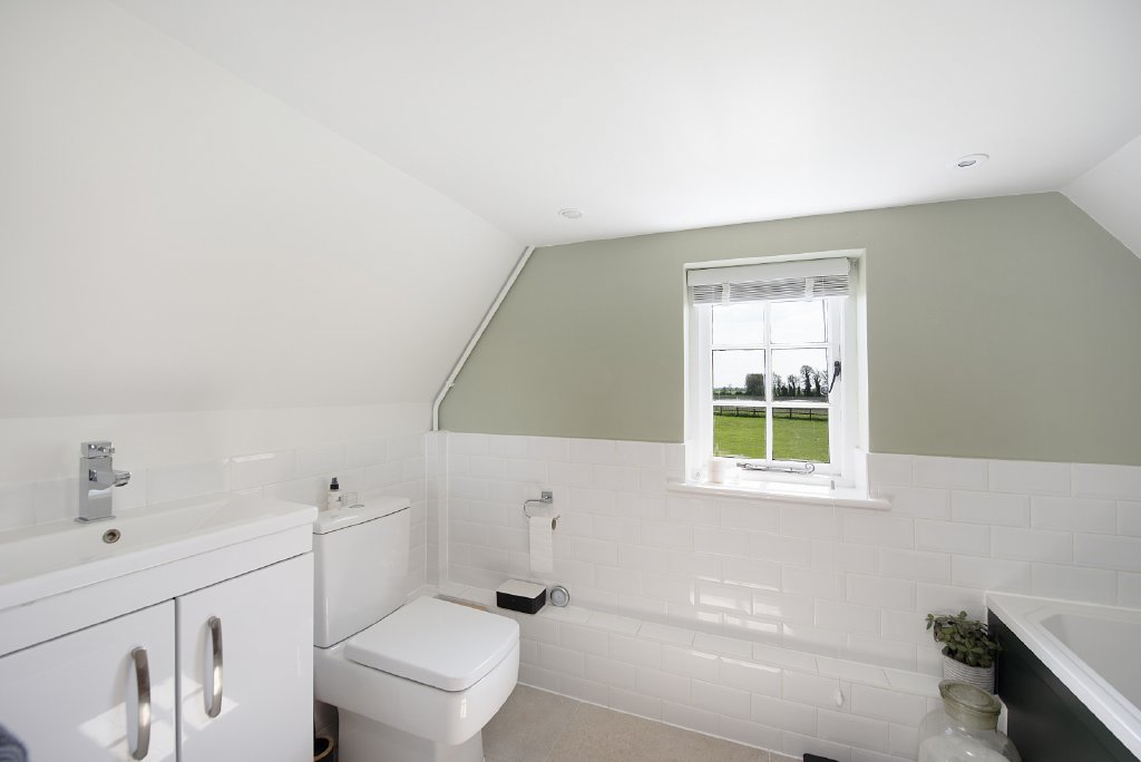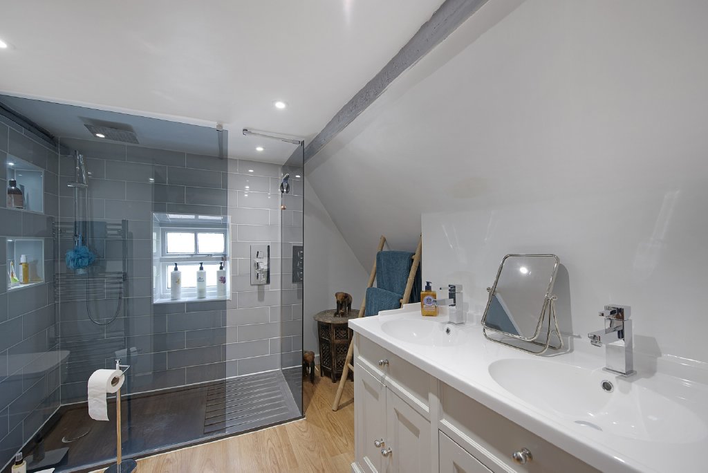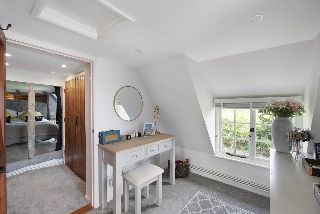 Upstairs, the principal bedroom offers a tranquil retreat with exposed beams, feature brickwork, and a generous dressing area leading into a newly refitted family bathroom. Two further double bedrooms, one with built-in storage and one currently used as a home office, are served by a second, stylishly refitted family bathroom.