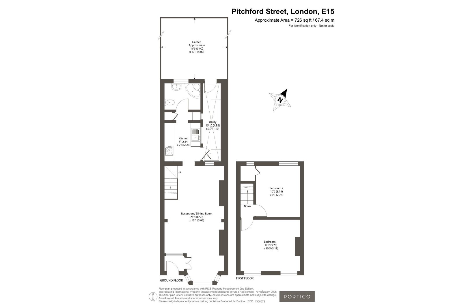 The ground floor offers a spacious living room leading into an open-plan kitchen, with a further reception/dining area at the rear providing access to the family bathroom. Upstairs, there are two generously sized double bedrooms, each with ample natural light and potential to create a comfortable home.