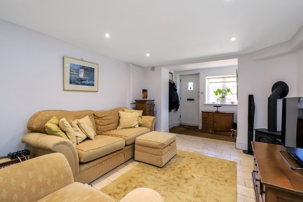 OPEN PLAN LIVING ROOM 13' 2" x 11' 3" (18'3" max.) decreasing to 8'0" at narrowest point (4.01m x 3.43m) Coir matted area leading to tiled flooring, double glazed window to front aspect overlooking driveway, gas wood burning stove, radiator, cupboard housing electric meter, ceiling spotlights, opening leading to kitchen, balustrade staircase rising to first floor, underfloor heating.