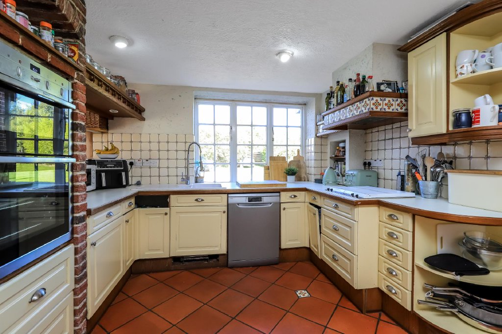KITCHEN 11' 7" x 13' 9" decreasing to 8'0" (3.53m x 4.19m) Comprehensive range of matching wall and floor units with wood block work surface, corner cupboard housing Worcester boiler supplying domestic hot water and central heating (not tested), butler sink with mixer tap and wood block surface to either side, integrated dishwasher with matching door, washing machine point, window overlooking driveway, inset induction four ring hob with oven under and extractor hood, fan and light over, range of drawer units, matching flooring, understairs storage cupboard, space for free standing fridge/freezer, ceiling spotlights and coving, underfloor heating with wall mounted controls.
