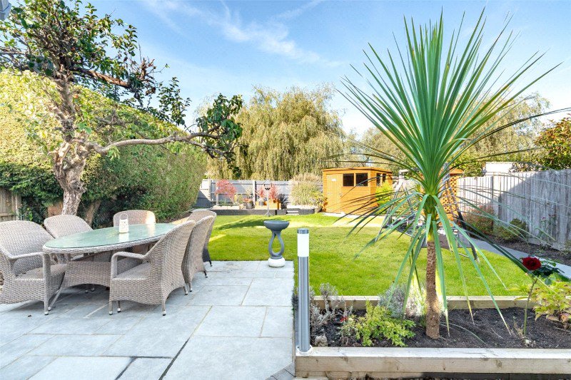 To the side of the house is a covered canopy area with a water tap. The nicely enclosed rear garden has recently been landscaped with a paved patio, lawn, exterior power and lighting, sleeper-edged borders, raised beds, and rear gate to a public footpath leading to the park and local shops.