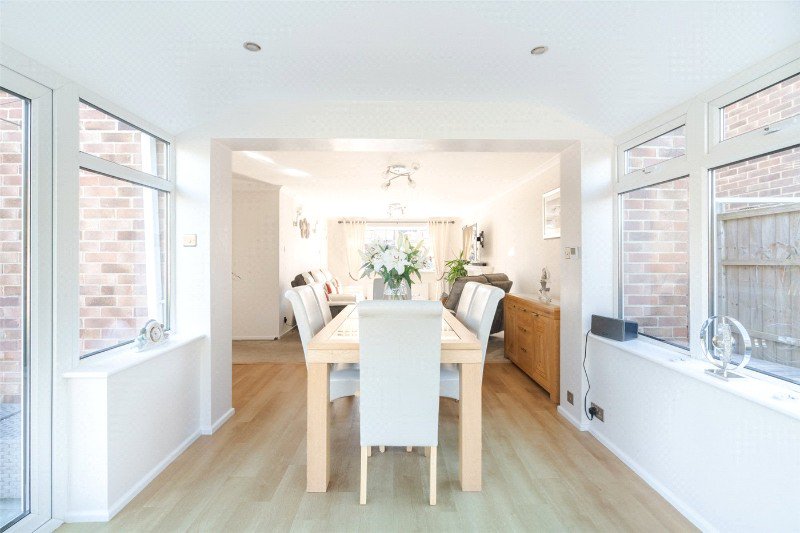 The spacious open plan dual aspect lounge/dining room has a decorative fireplace (with inset electric fire), and leads into a conservatory with Karndean flooring, electric under floor heating, recessed lighting, and French doors to the rear garden.
