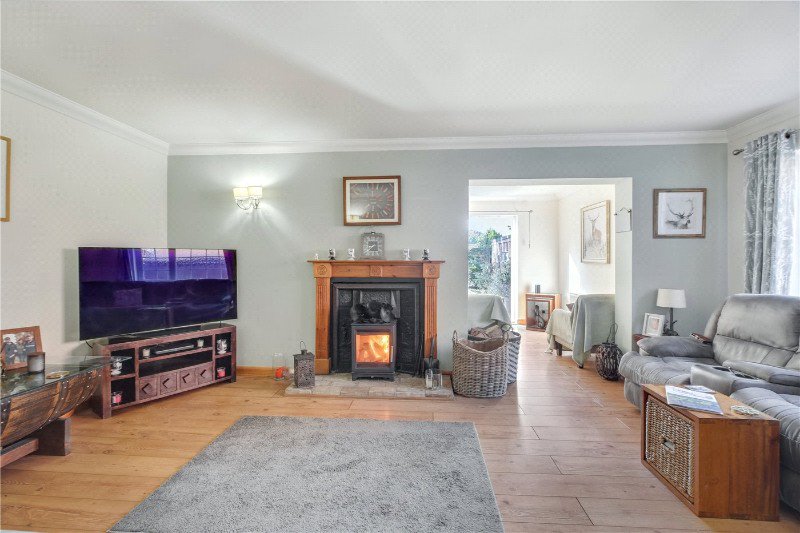 Inside, the accommodation flows beautifully and suits both family life and entertaining. A formal, double-aspect dining room offers a light-filled space for hosting, while the opposite side of the hallway reveals a classic shaker-style kitchen, finished with solid granite worktops, an immaculate stainless steel range cooker, and a built-in wine rack that adds both character and functionality. These well-appointed rooms complement the heart of the home, an inviting main lounge where a cast iron woodburning stove provides a warm, focal point throughout the cooler months.