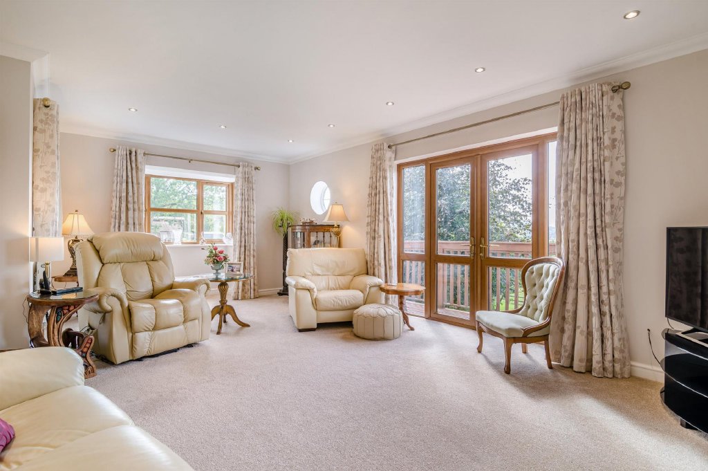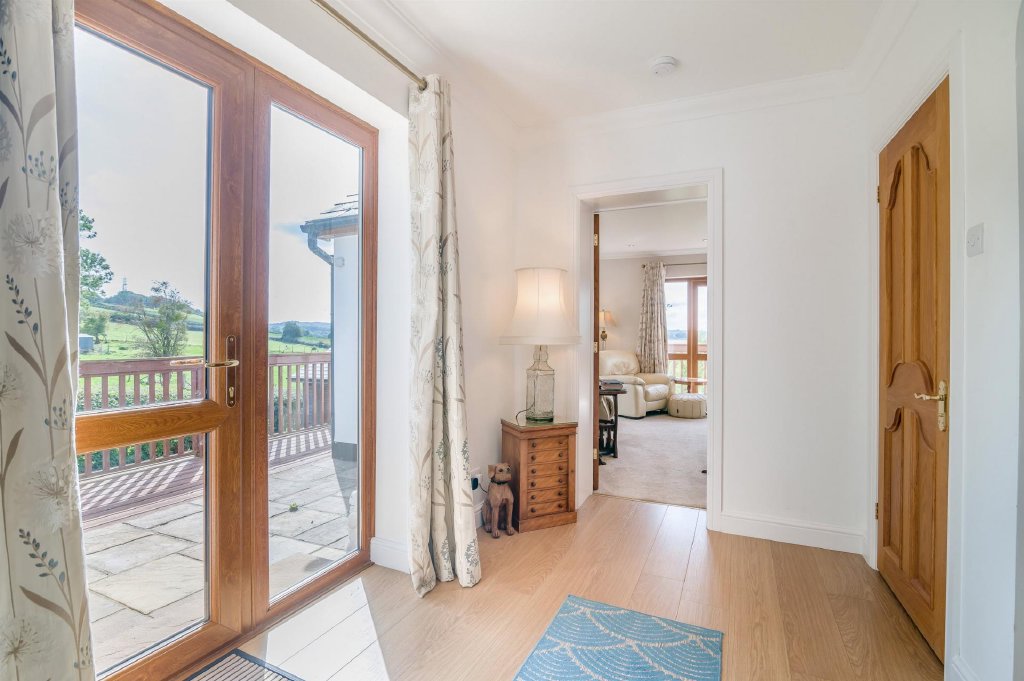 The hallway leads directly into a lovely bright and spacious living room, with incredible views across beautiful green countryside towards Ross-on-Wye and the hills beyond, with access outside via French doors to a wraparound balcony and paved sun terrace.