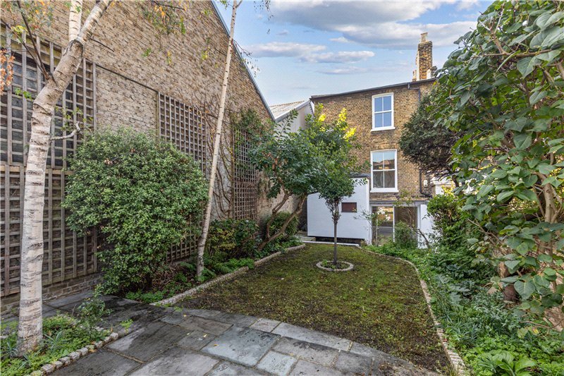 To the rear, the private east-facing garden has been thoughtfully landscaped with a paved patio, lawn, and trees, providing an ideal space for al fresco dining or outdoor entertaining.