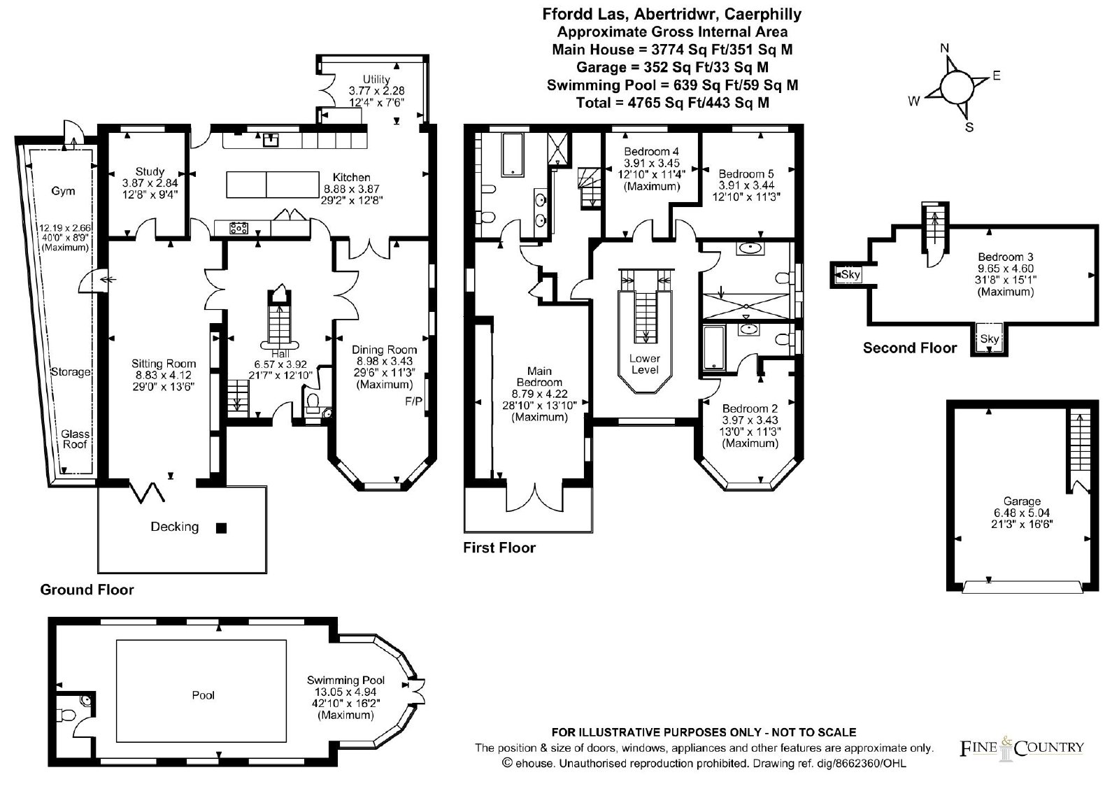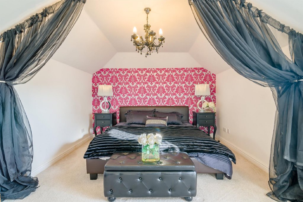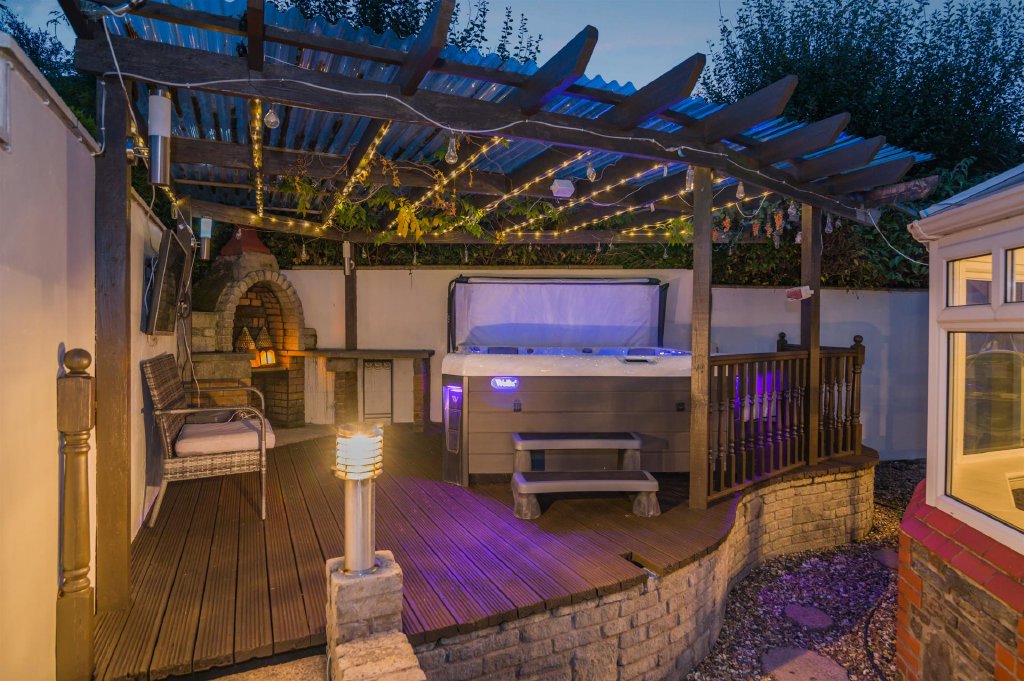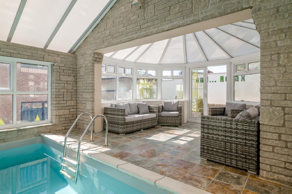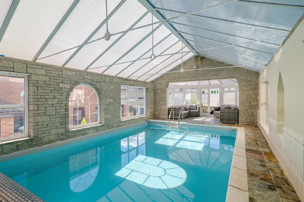 The rear garden has a patio and an enclosed, heated swimming pool, with a decked area providing ample space for a hot tub and barbecue oven, making it a perfect spot for entertaining. There's a small pond and concealed lighting brings the garden to life at night.