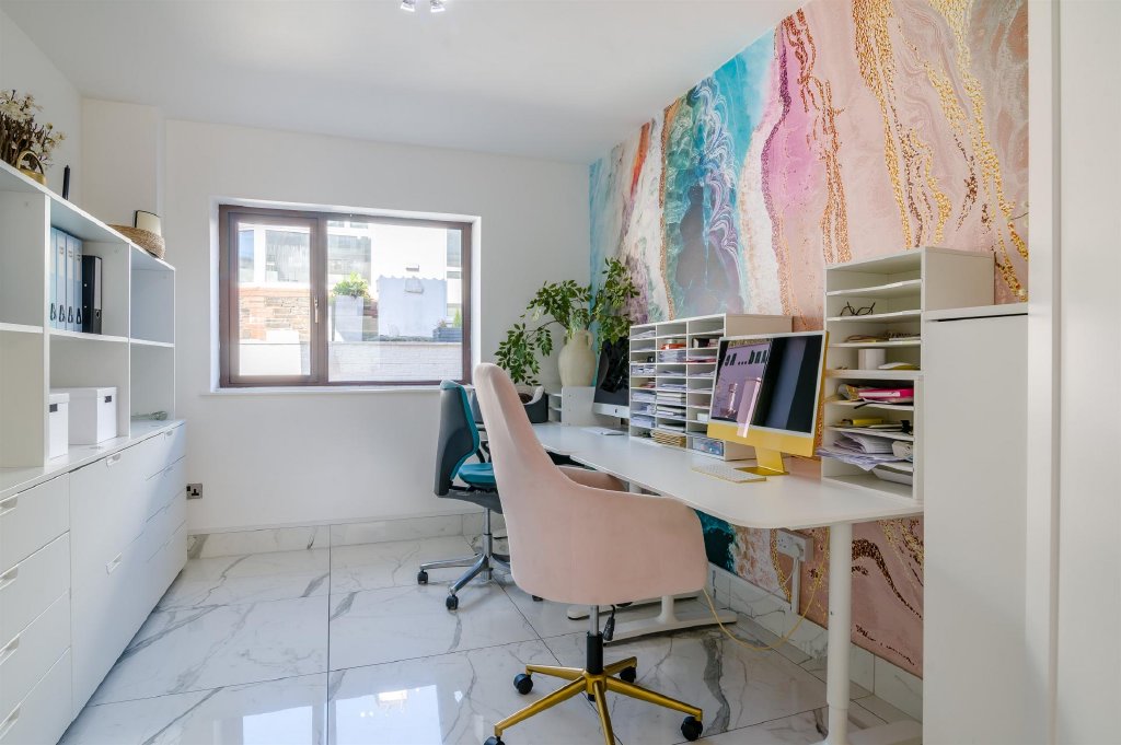 The spacious principal bedroom has large built-in wardrobes and its own balcony. Its en suite features a standalone bath and twin sinks. A further bedroom can be found on the second floor, with skylights ensuring it remains light and airy for much of the day.
