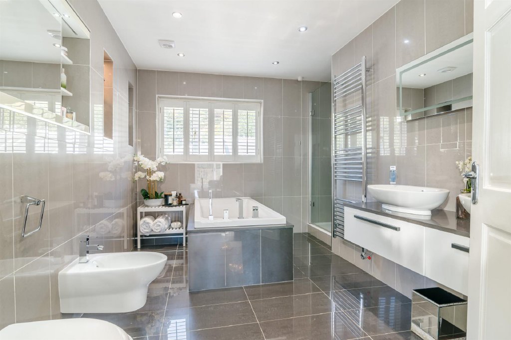 A study lies to the rear of the property, next to which is a large kitchen with wipeable fitted units with gold inlay, integrated Miele appliances and a central breakfast bar. There's plenty of space in the kitchen for a family dining table. A utility room lies beyond.