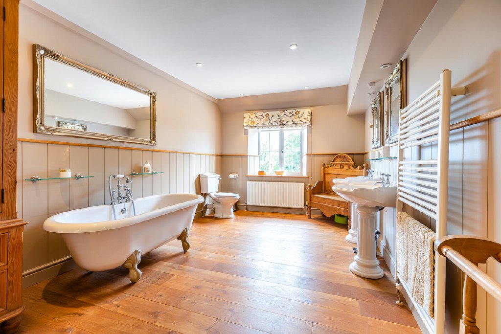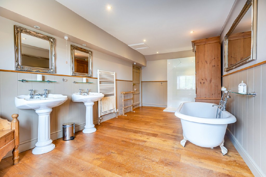 The luxurious main bathroom is generously proportioned and exudes classic elegance, blending period-inspired details with modern convenience. It features a large walk-in shower enclosure and a freestanding claw-foot bathtub positioned beneath a wall mirror, creating a calm and relaxing space to unwind. Twin pedestal basins add both practicality and style.