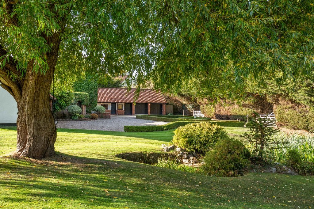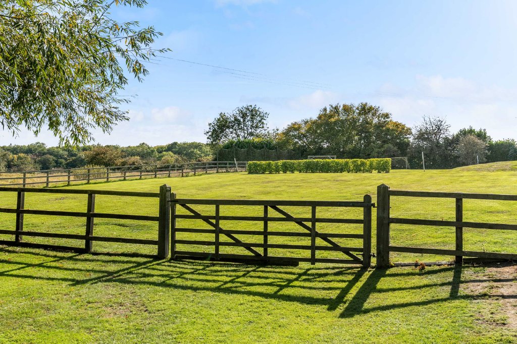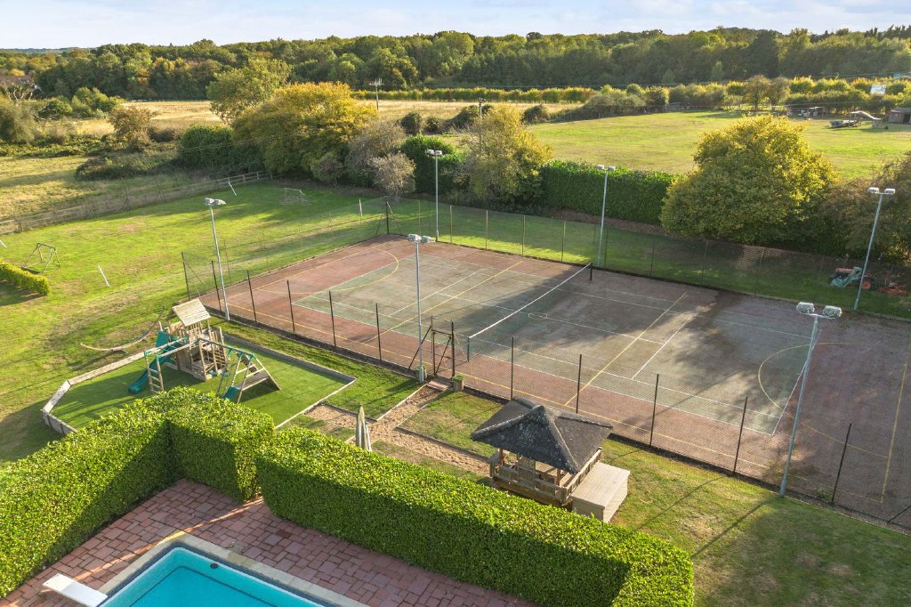 The grounds at Barfield Farm extend to approx. 1.6 acres with mature trees, manicured lawns and hedging framing the views over surrounding open countryside. A sun-soaked terrace leads to the secluded swimming pool and, beyond, a floodlit tennis court, a football pitch and purpose-designed children’s play area with safety padding and artificial grass. One of the property’s most charming features is the natural self-filling pond, sheltered by a willow tree, a peaceful haven for local wildlife and visiting birds.
