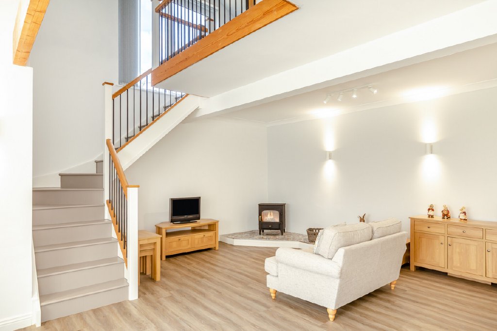 You will find the sitting room of the potential annexe next to the living room accessed via the main house. This impressive reception room is a bright and welcoming space, enhanced by its double-height ceiling, exposed beam, and full-height windows. A feature wood-burning stove creates a cosy focal point, while French doors provide direct access to the garden, making it an ideal room for both entertaining and everyday family living.