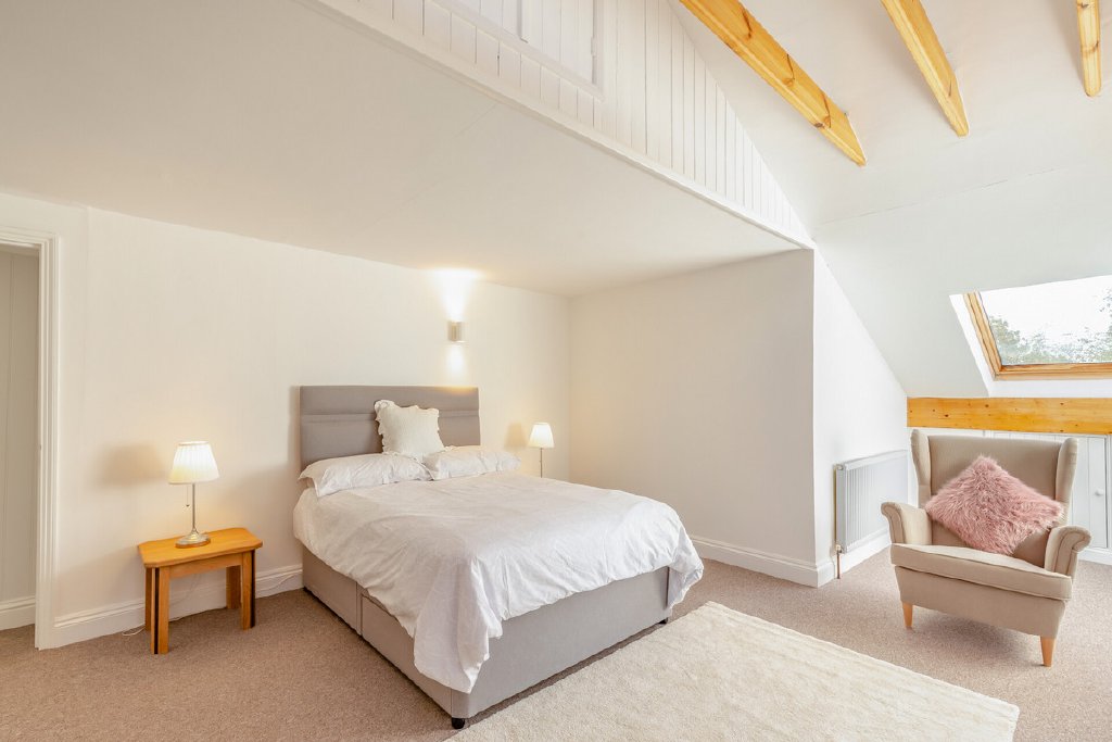 Walking up the stairs to get to the bedroom, there is a landing currently used as an office space with a balcony which offers a delightful spot to enjoy the surrounding gardens and landscape.