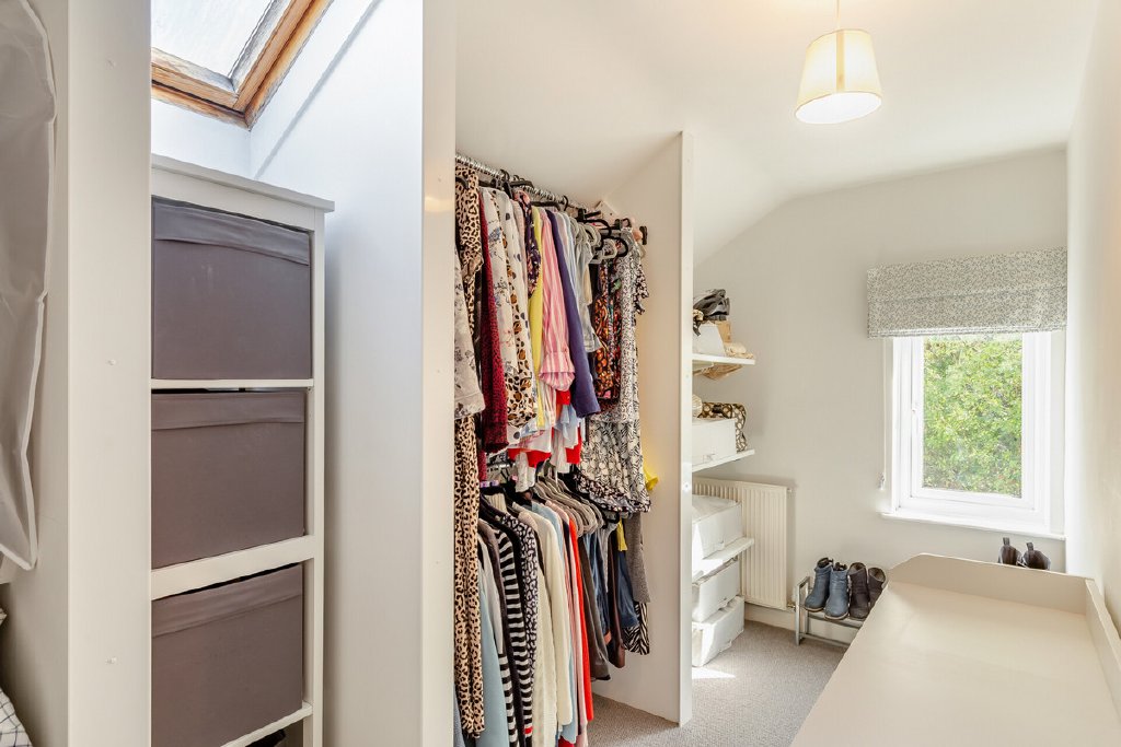 Upstairs, you have a comfortable and well-proportioned main bedroom, enjoying a dual-aspect outlook over the gardens. With clean décor and plenty of natural light, you can also take advantage of the adjacent dressing room, providing excellent storage and convenience.
