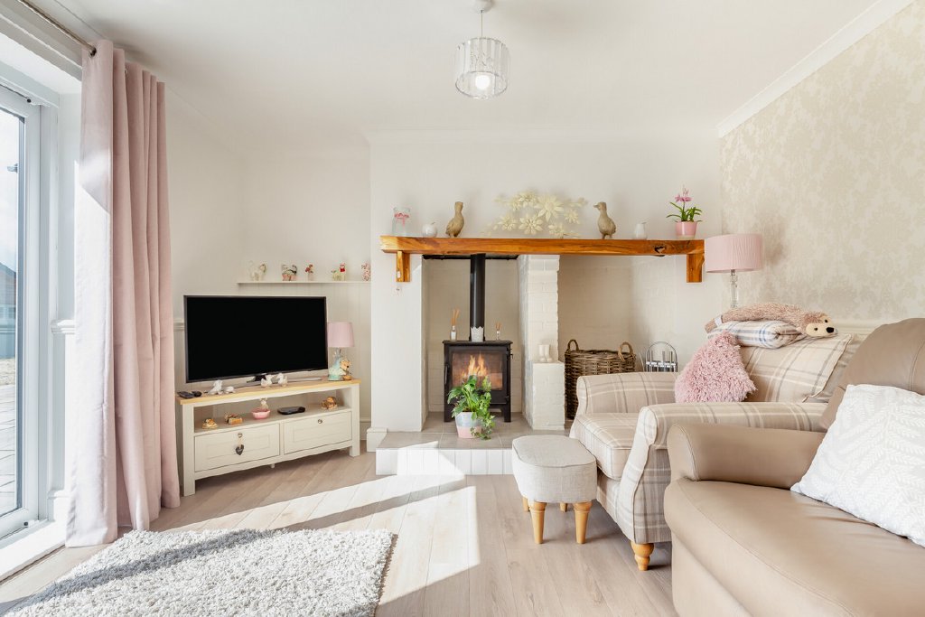 Down the hallway you will find the living room which has been perfectly designed for comfort and relaxation. Featuring a large sliding door that opens directly to the garden and floods the room with natural light. The views of the landscaped outdoor space make this an inviting retreat for the whole family. Additionally, you will find a log burner set within a characterful fireplace providing a charming focal point, crafting a cosy ambience during the cooler months.