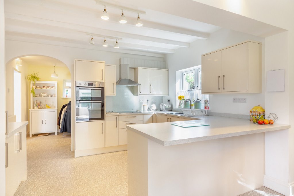 The heart of the home is a bright and contemporary kitchen, finished with sleek cream cabinetry, integrated appliances, and ample storage throughout. A central peninsula provides both extra workspace and a breakfast bar, making it perfect for everyday living. Large windows bring in natural light, giving the kitchen a fresh, airy feel.