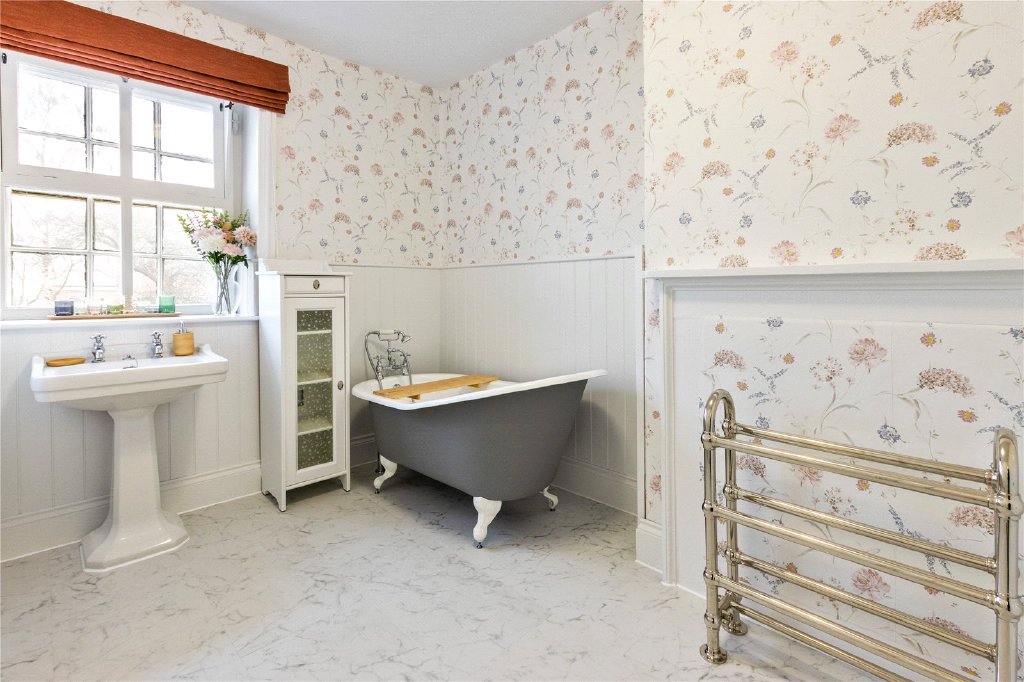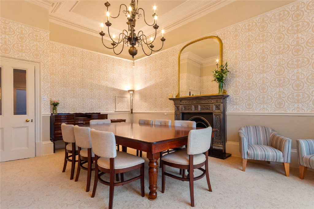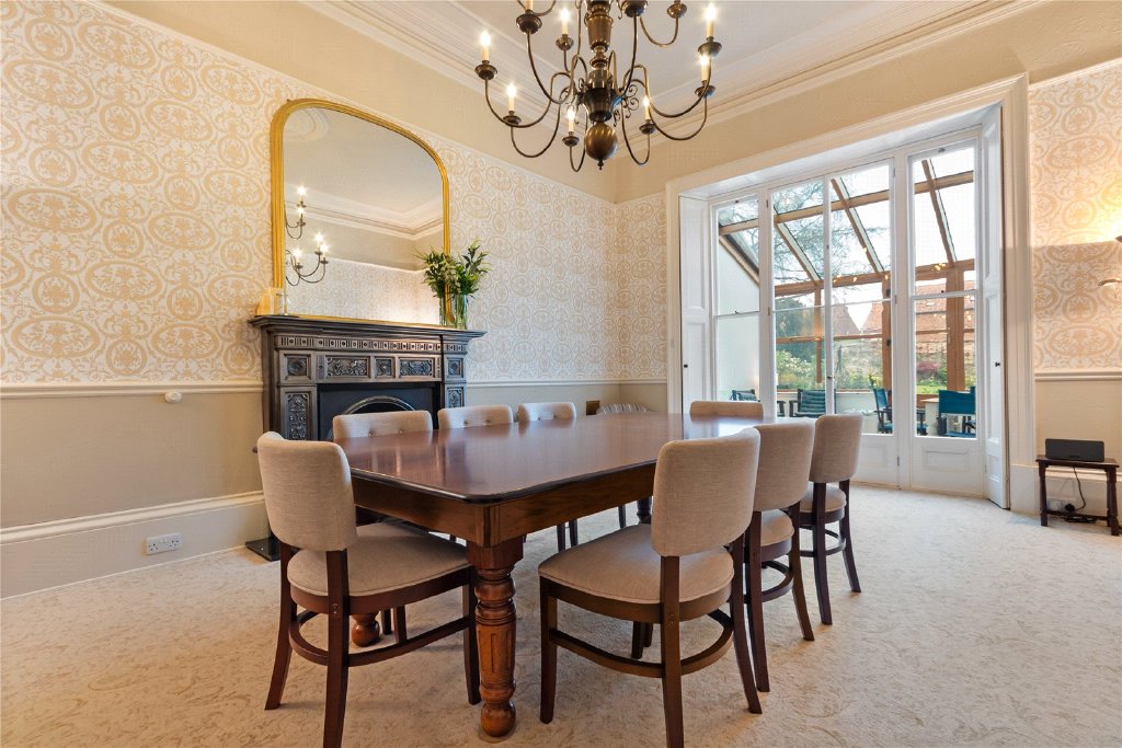 To the rear of the home, a striking Victorian dining room with high ceilings and a traditional cast iron fireplace opens into a beautifully rebuilt conservatory, modelled on the property’s original period structure. This light-filled space connects seamlessly to the garden, creating a tranquil setting for everyday living and entertaining.