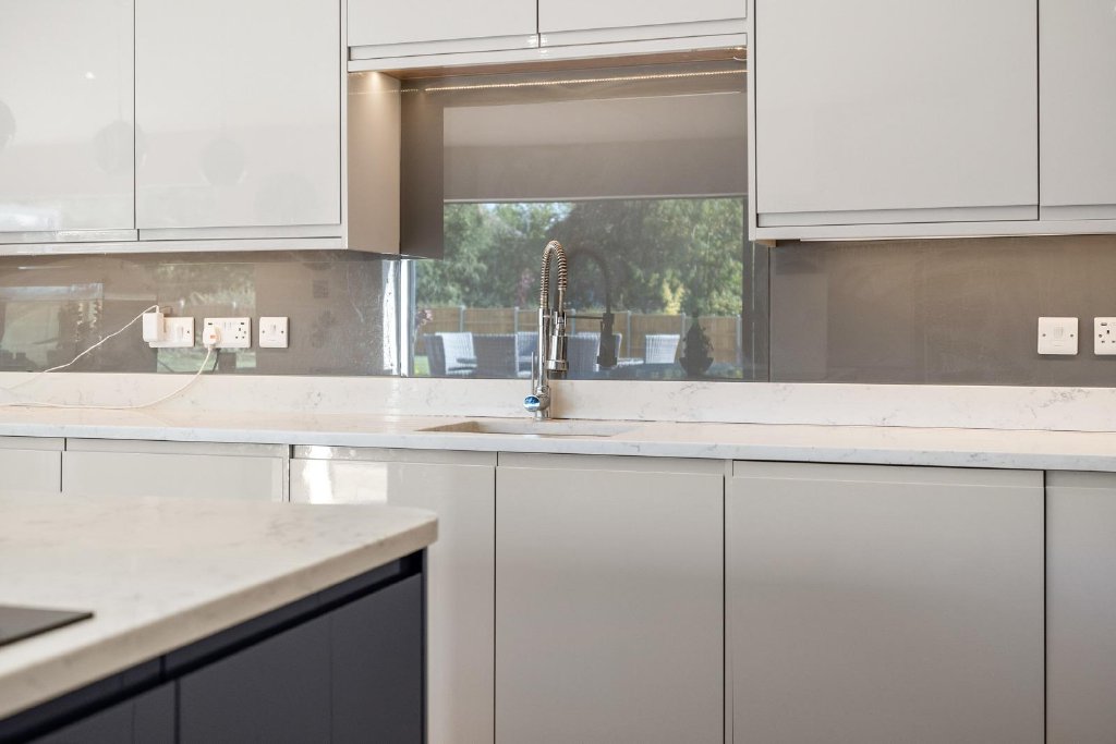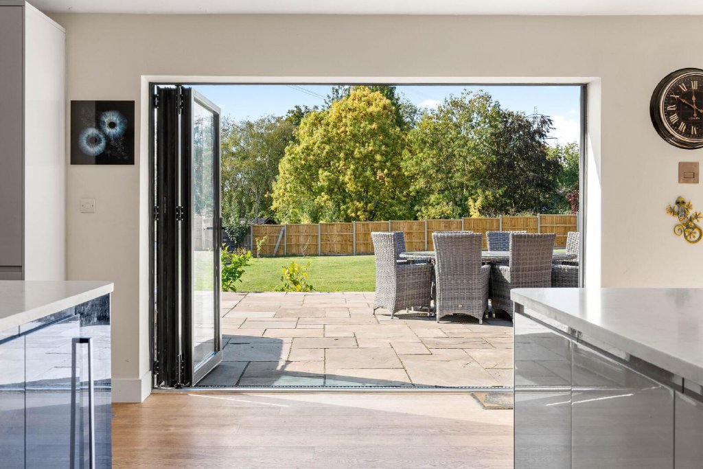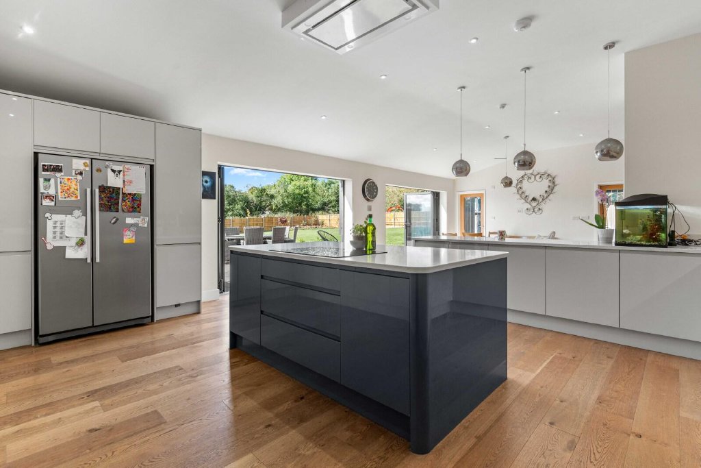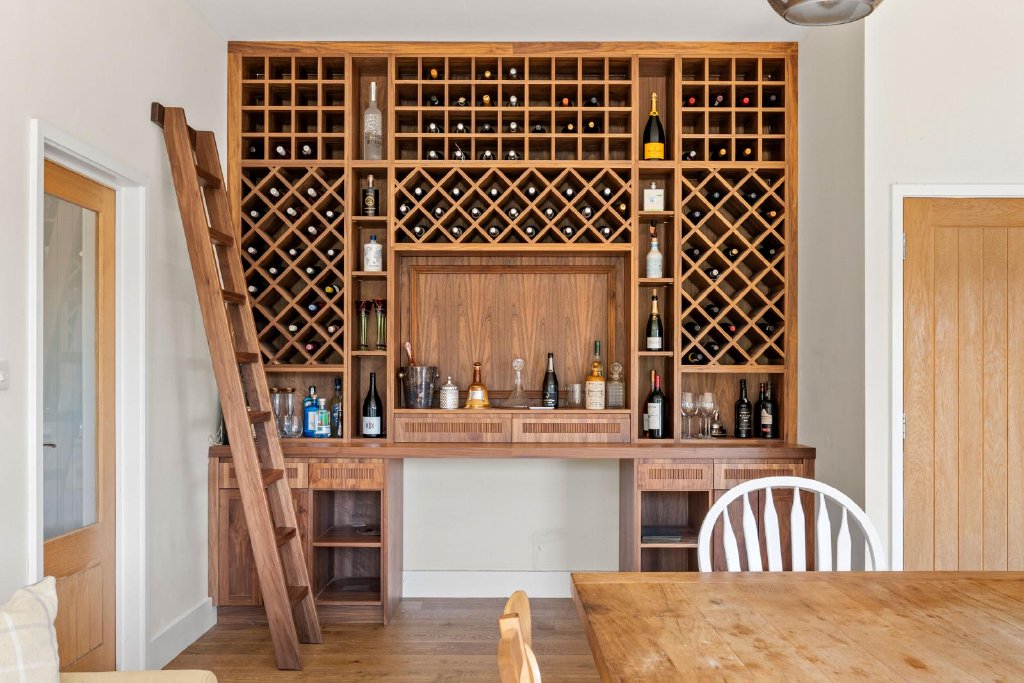 There is a central staircase from the dining hall leading up to the kitchen, living, dining area, with double French doors which open into the main entertaining space. Bi folding doors across the back of the property enables a beautiful entertaining space combining kitchen, living, dining area with the spacious patio and garden. A modern, contemporary kitchen with quartz worktops throughout, a central island and breakfast bar with seating area. A dining area or a space for sofas where all the family can sit together, a built in bespoke walnut handmade bar and wine wall creates the ultimate entertaining space. There is a side entrance with boot room, shower room and separate utility area, perfect for mucky boots when you have been out in the countryside utilising the stunning walks on your doorstep.