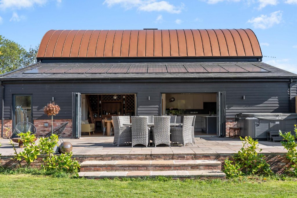 The Property A unique, detached five-bedroom Dutch barn built in 2021 by the current owners with a 10-year warranty. Set in a stunning location in Debden Green, Saffron Walden. The property offers 4520 sq. ft. of accommodation and sets over three levels. There are five bedrooms all with ensuites and air conditioning, a family shower room and on the ground floor a further cloak room and shower room off the boot room. There are four reception rooms on the ground floor and a lounge on the top floor. A beautiful open plan kitchen, living, dining room across the rear of the property with bi folding doors leading out to the large patio. This is an ideal family home set within approximately 0.5 acres with views over rolling countryside. The barn is equipped with solar panels, air source heating, air conditioning in bedrooms and a fire suppression system throughout the property. A new private sewerage treatment plant was installed in August 2025. The property benefits from being EPC band A and is council tax band H. It is offered with no onward chain.