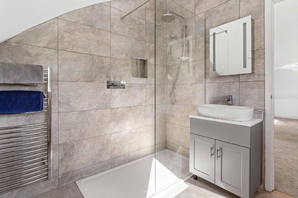The rear garden is enclosed with large patio area from the kitchen, living, dining area, ideal for BBQ’s and entertaining and steps down to a laid lawn and recently planted laurels. There is a shed / garden store which has just been built. The total plot is approximately 0.5 acres and has views over the rolling countryside.