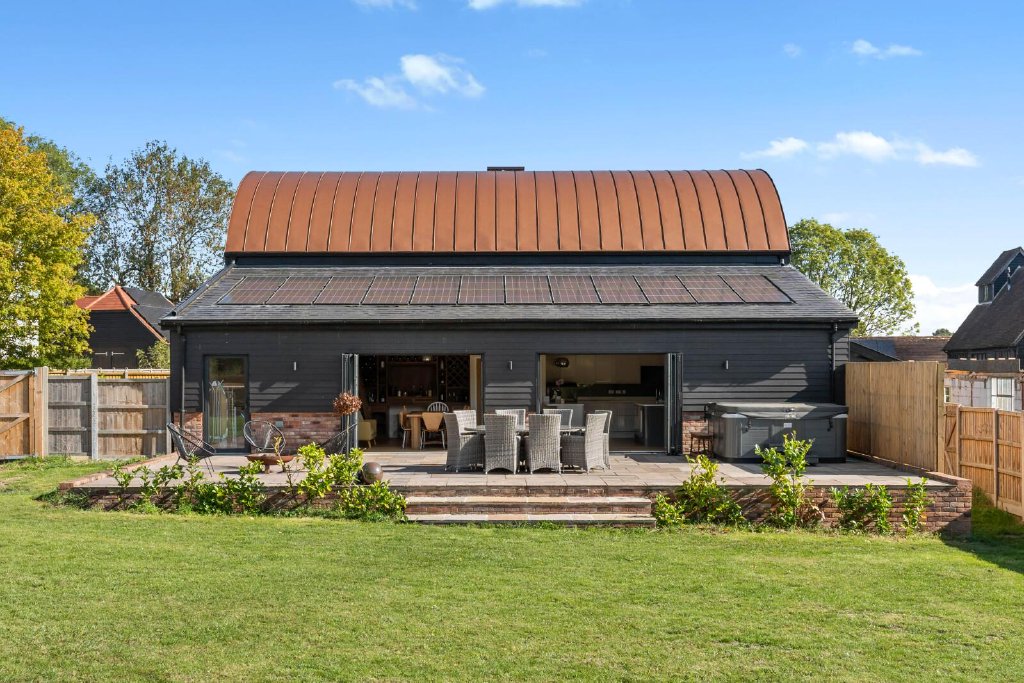A unique, detached five-bedroom Dutch barn built in 2021 by the current owners with a 10-year warranty. Set in a stunning location in Debden Green, Saffron Walden just 15 mins drive from Stansted Airport and rail links to London. The property offers 4520 sq. ft. of accommodation and is set over three levels. There are five bedrooms all with ensuites and four reception rooms on the ground floor. This is an ideal family home set within approximately 0.5 acres with views over rolling countryside. The barn is equipped with solar panels, air source heating, air conditioning in bedrooms and a fire suppression system throughout the property. The property benefits from being EPC band A and is council tax band H. It is offered with no onward chain.