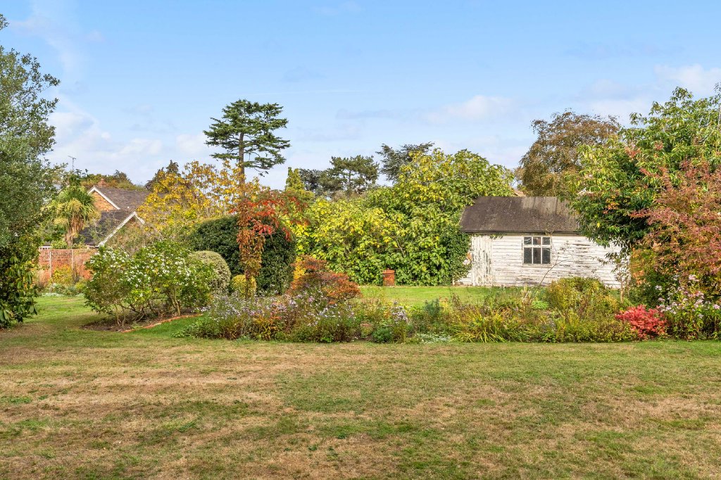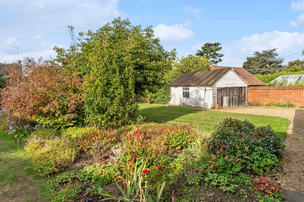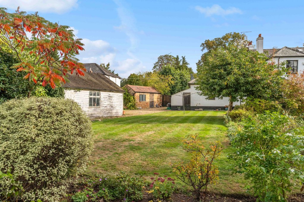 The gardens and grounds extend to approximately half an acre and are a particular highlight of the property. The wide and deep rear garden is mature and beautifully established, including a number of mature fruit trees including a fig tree and a grapevine, creating a secluded sanctuary that feels wonderfully private despite the urban location of Shenfield Cottage. To the side of the cottage, a gate leads to a garage (in need of repair), accessible via the in-and-out carriageway driveway at the front of the home, providing practical parking and storage options.