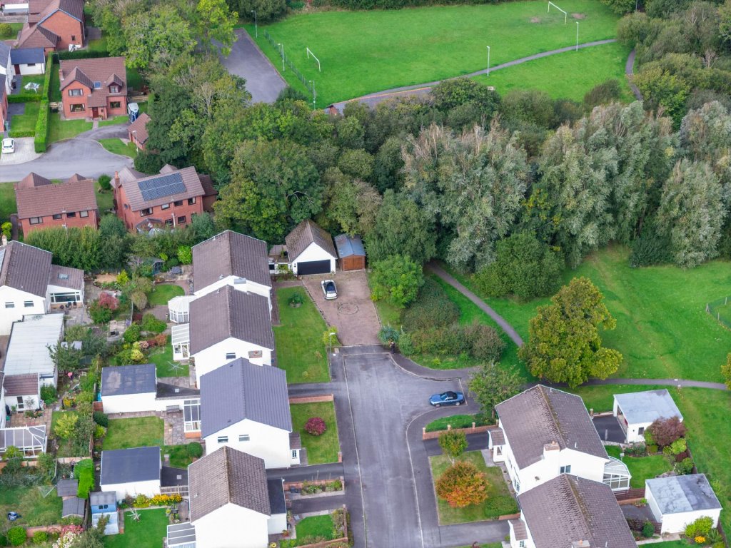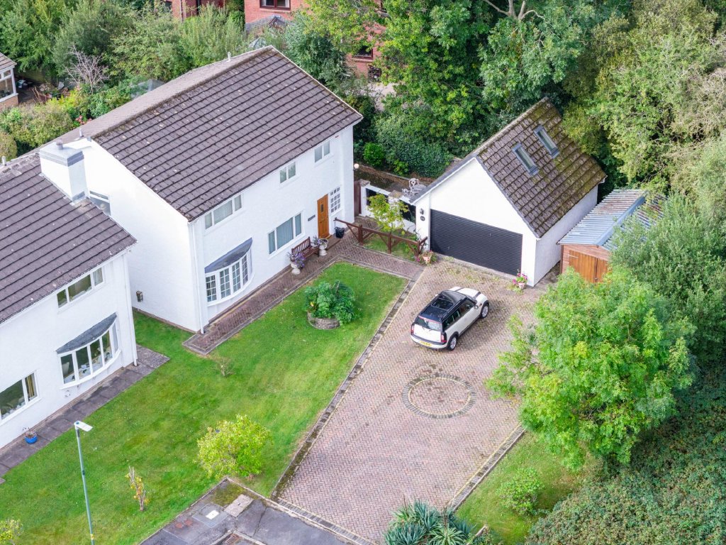 Outside, a large herringbone brick driveway provides parking for up to five vehicles and leads to a double garage with an electrically operated door and staircase to a useful first floor room above. The rear garden is mainly lawn with a patio, mature planting, and a good degree of privacy, with a side gate offering access to nearby woodland.