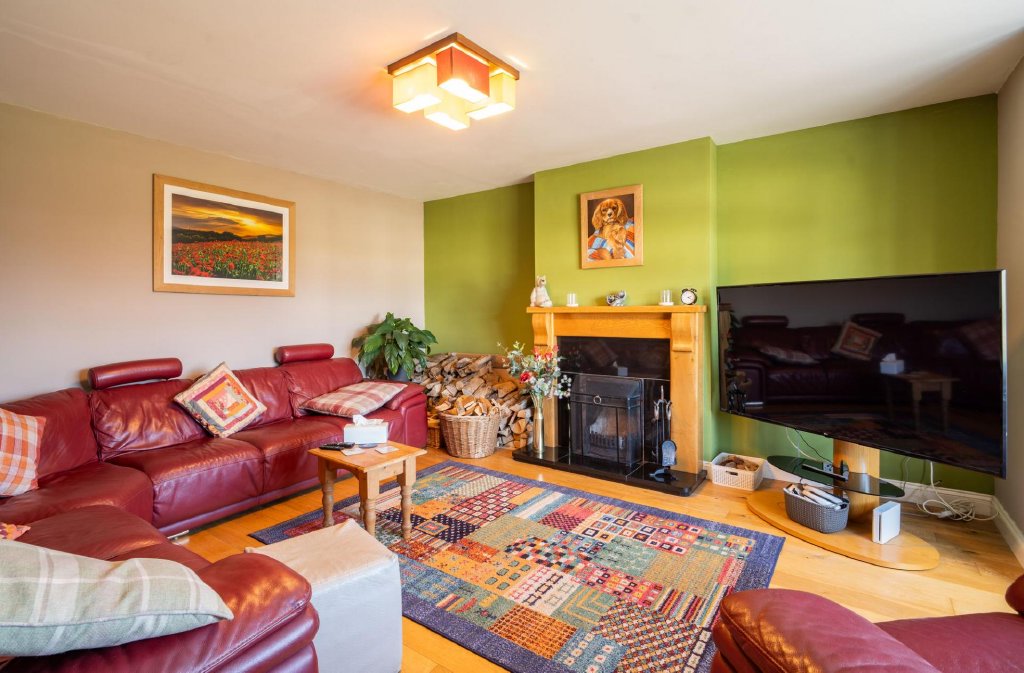 Two generous reception rooms provide versatile living: a sun-filled family lounge with garden access, and a cosy living room featuring a wood-burning stove.