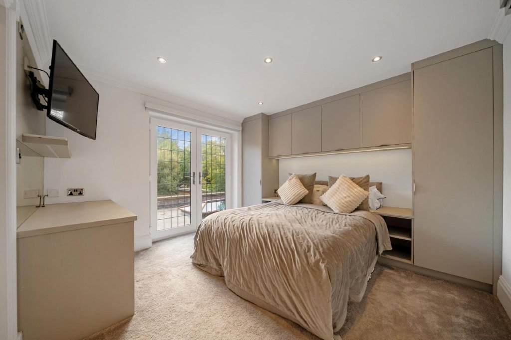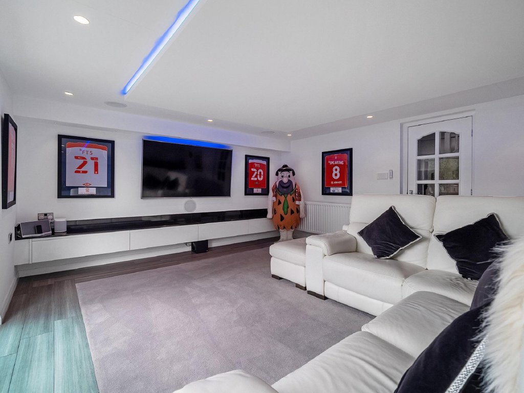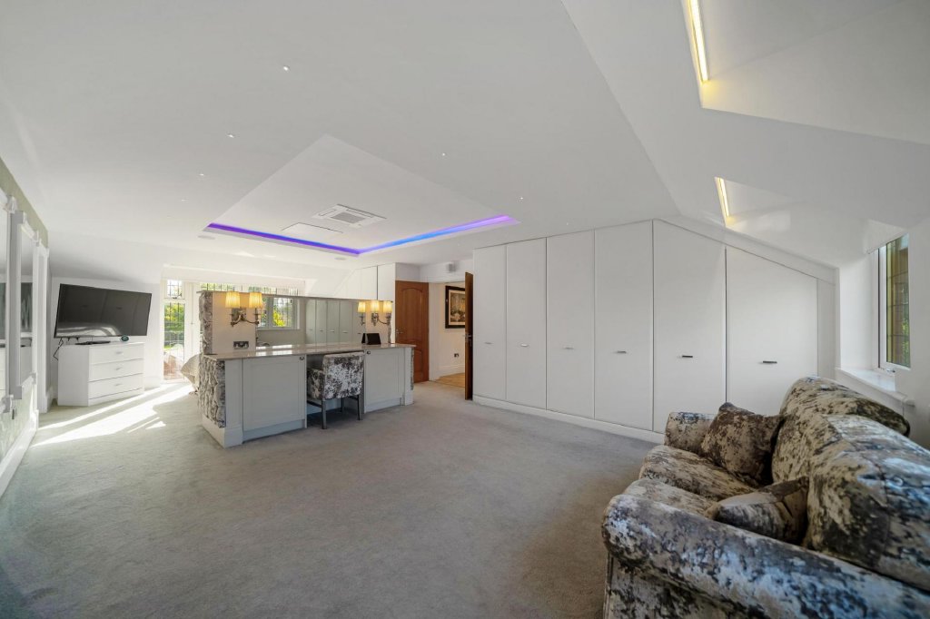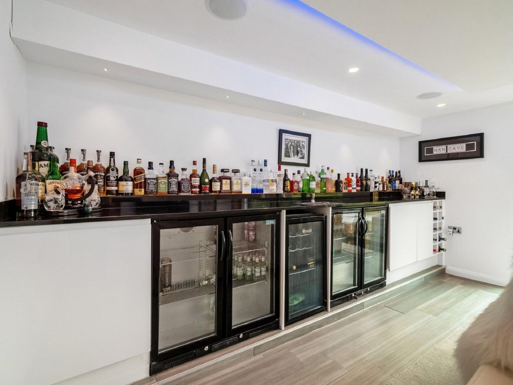 The detached double garage has been cleverly transformed into a stylish and versatile annexe, offering an additional dimension to this exceptional home. Inside, you will find a games room with kitchenette, a cinema style lounge and bar area, and a contemporary shower room. The lounge area opens directly onto its own private patio, creating a seamless flow for outdoor relaxation and entertaining. Upstairs, a spacious bedroom provides self contained accommodation, ideal for guests, extended family, or older children seeking independence. This space combines functionality with style, seamlessly integrating with the main house while maintaining privacy and flexibility for a variety of lifestyle needs.