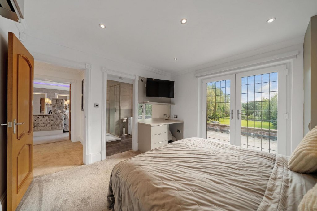 The master suite is a true statement of indulgence, a private haven within the home. Expansive in size, it includes a lounge area for relaxation, a beautifully appointed walk in dressing room, and a luxurious ensuite bathroom featuring a double jacuzzi bath and twin vanities. French doors open directly onto a private roof terrace, providing elevated views across the gardens and grounds, the perfect spot to enjoy a morning coffee or a peaceful evening under the stars. Every element has been designed to combine comfort, elegance, and a sense of sanctuary.