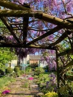 Set back from the road, many visitors comment on the peaceful quietness and birdsong. The gardens are based on cottage garden design, with trees, shrubs and mainly perennial flowers such as cowslip, hellebores and snowdrops in the spring, to foxgloves, delphinium, roses, geranium, etc. which attract a multitude of pollinating insects.