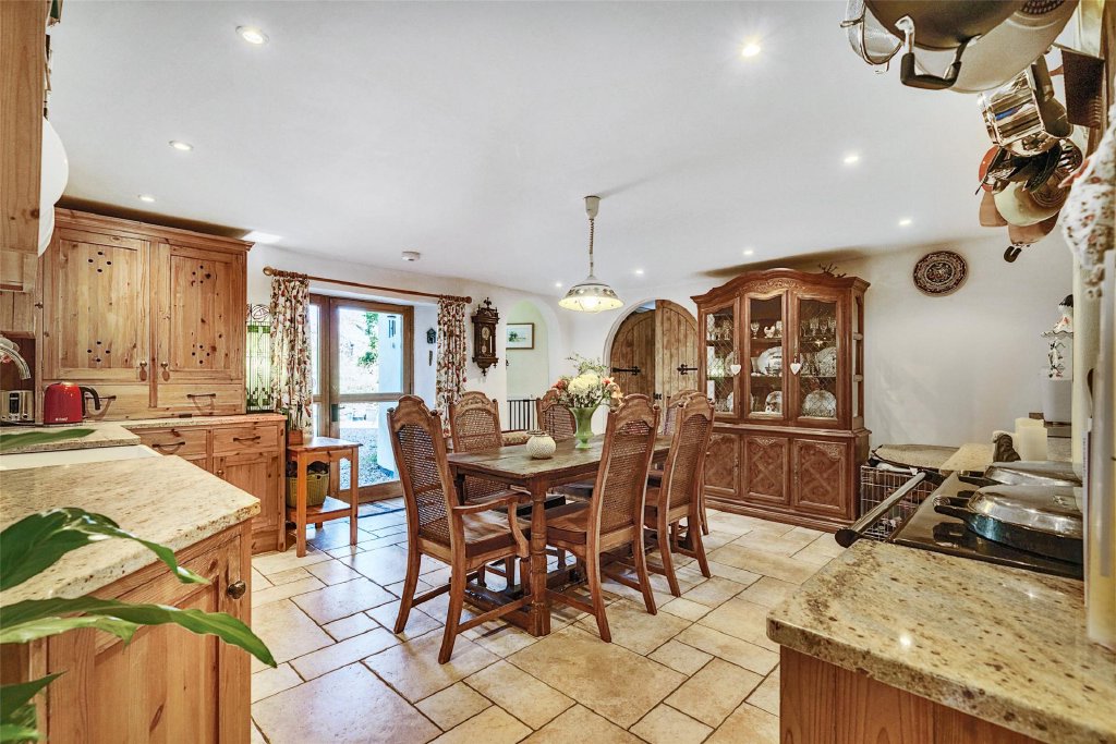 Gothic-style arched doors open into the spacious sitting room, where large oak-framed double-glazed windows beautifully frame the garden, filling the room with natural light.
