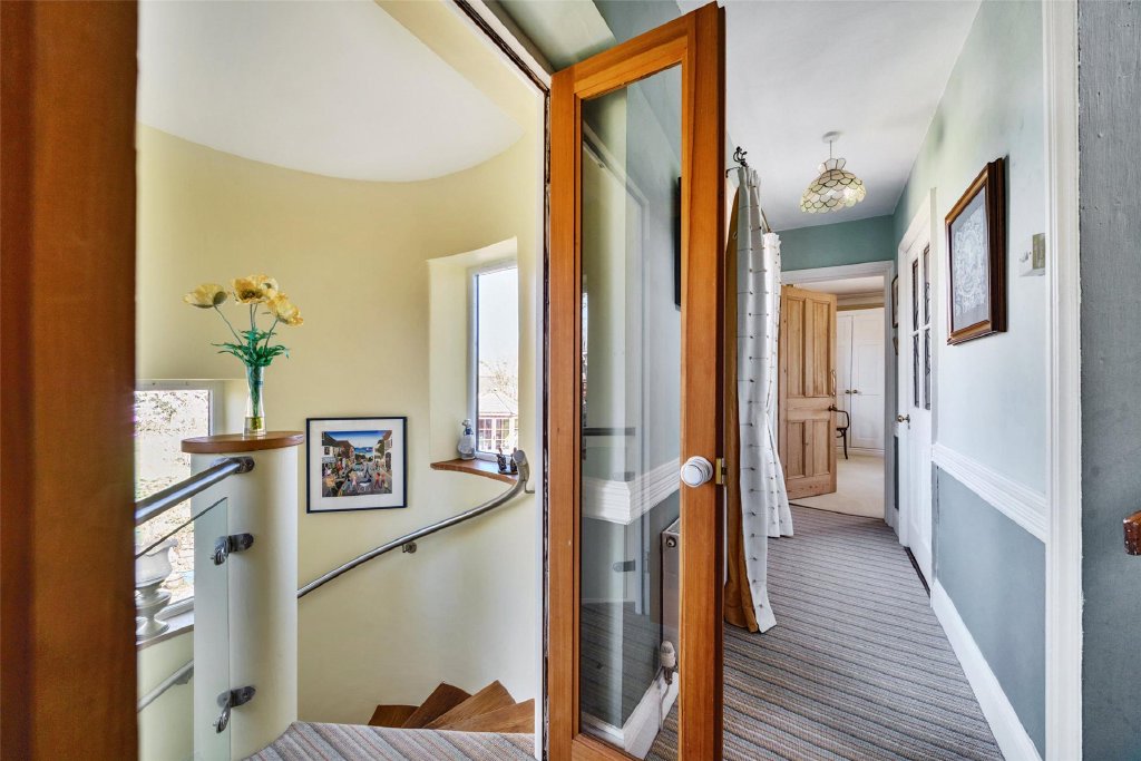 A striking oak spiral staircase rises to the first floor, where a spacious study/4th bedroom enjoys wonderful garden views. French doors open onto a balcony—an ideal spot to relax, whether indoors or out. A side door also provides direct access to the village lane.