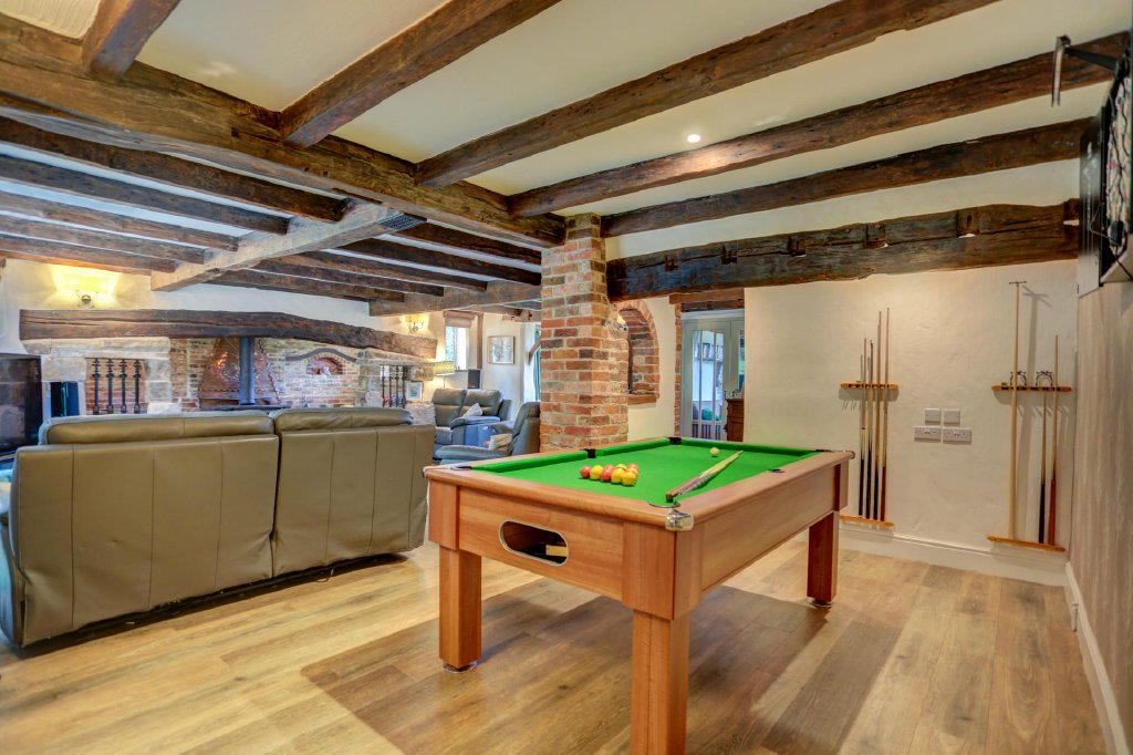 Upstairs, four generously sized double bedrooms and three bathrooms are found. Each bedroom benefits from built-in storage, with ample room for additional furniture if desired. The primary suite is a luxurious retreat, featuring exposed beams, high ceilings and breathtaking views from every window. A stylish ensuite with a jacuzzi bath and separate shower completes this sanctuary. Of the remaining bathrooms, one offers a walk-in shower while the other provides a roll-top bath, ensuring convenience for the whole family.